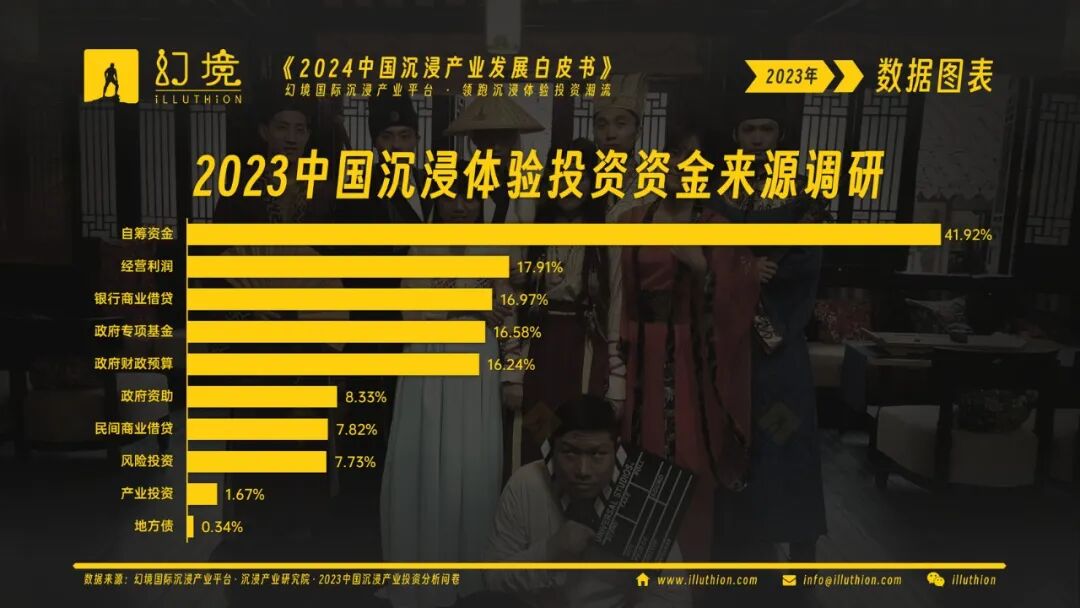 在资金供给方面,政府的角色也极为关键。地方国企通过多种渠道为沉浸体验项目提供资金支持,包括银行商业贷款(16.91%)、政府专项基金(16.58%)、政府财政预算(16.24%)、政府资助(8.33%)和地方债(0.34%)。这些数据突显了政府在推动沉浸产业成长中的积极作用,这些资金将通过地方国企进入沉浸产业。