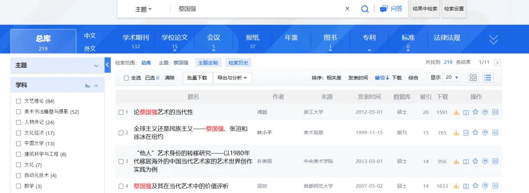 蔡国强是大名鼎鼎的烟花艺术家,在知网搜索「蔡国强」有219篇和他有关的论文。