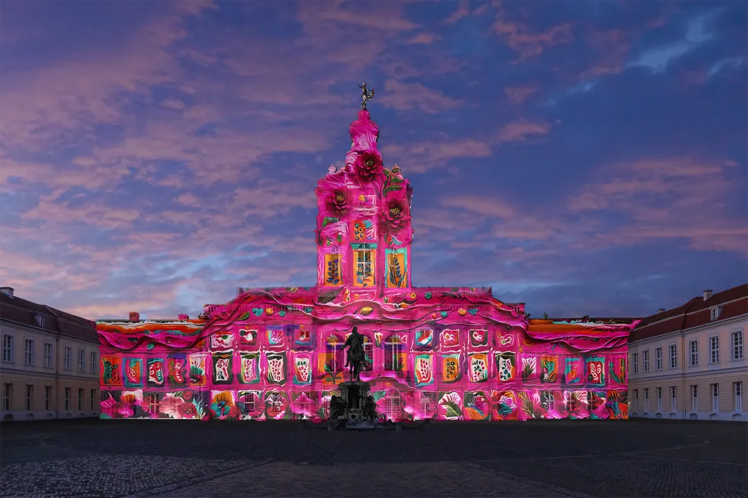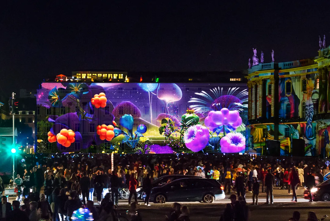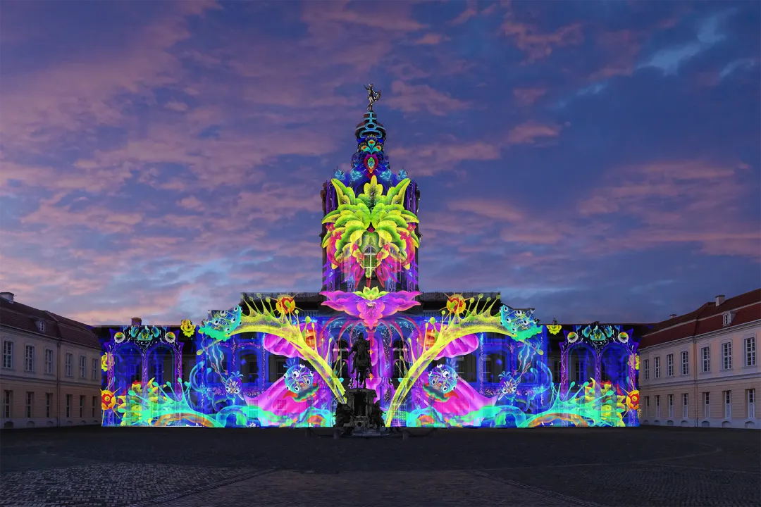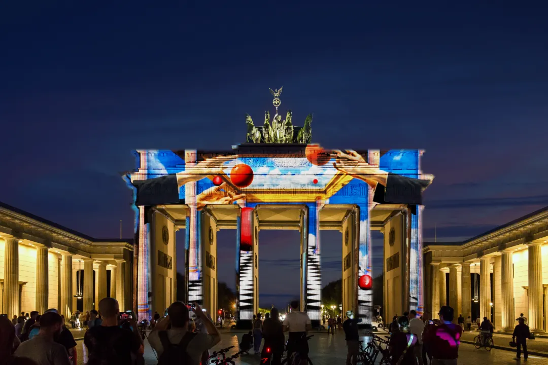 勃兰登堡门变成了一个由金色、橙色和红色构成的分形宇宙。复杂的、不断重复的动画在建筑表面展开,让观众沉浸在一场由光、色彩和无限的图案所构成的明亮盛宴中。