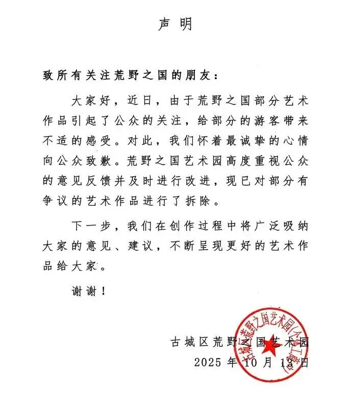 荒野之国艺术园致歉声明。图片来源:@荒野之国