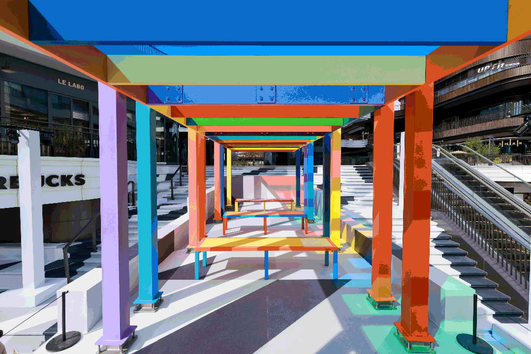 艺术家的代表作之一《永续论台》,以四个彩色立柱平台构筑其形式,顶部覆以彩色有机玻璃,其下设置长凳,形同日常社交的微缩图景。作品本意在于营造一个思辨性的场域,唤起观者对人际互动及其环境脉络的微妙感知。