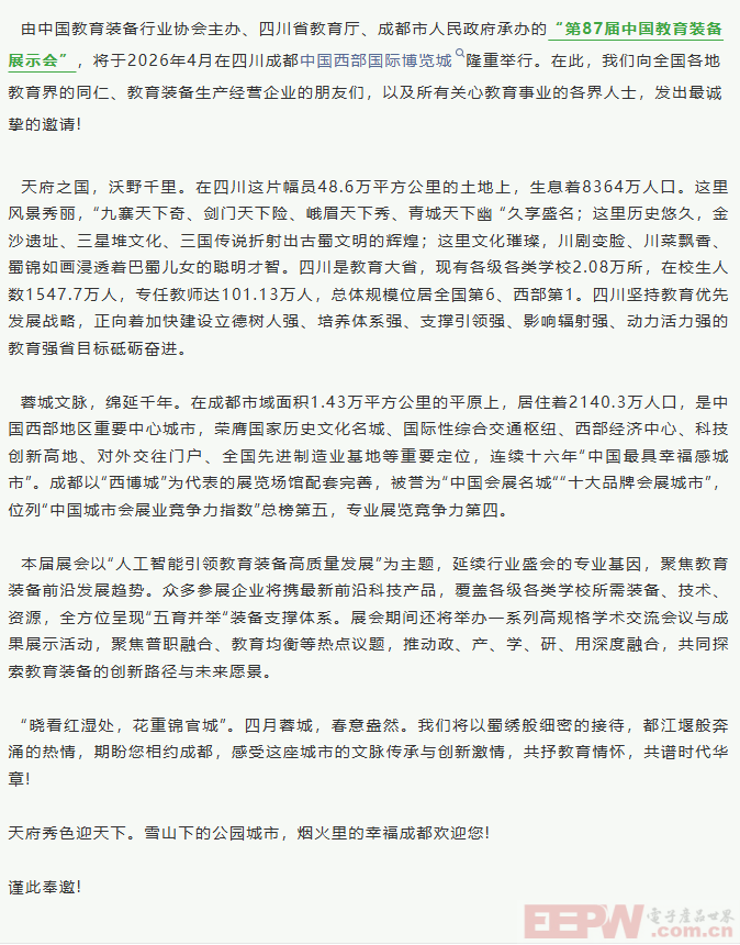 第87届中国教育装备展示会将于2026年4月24日至26日在成都·中国西部国际博览城举办,展位预订报名已正式启动。以下是关键信息汇总: