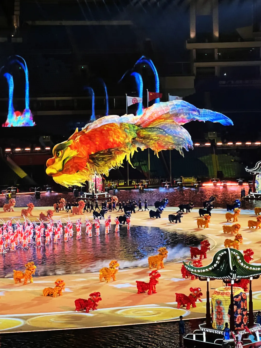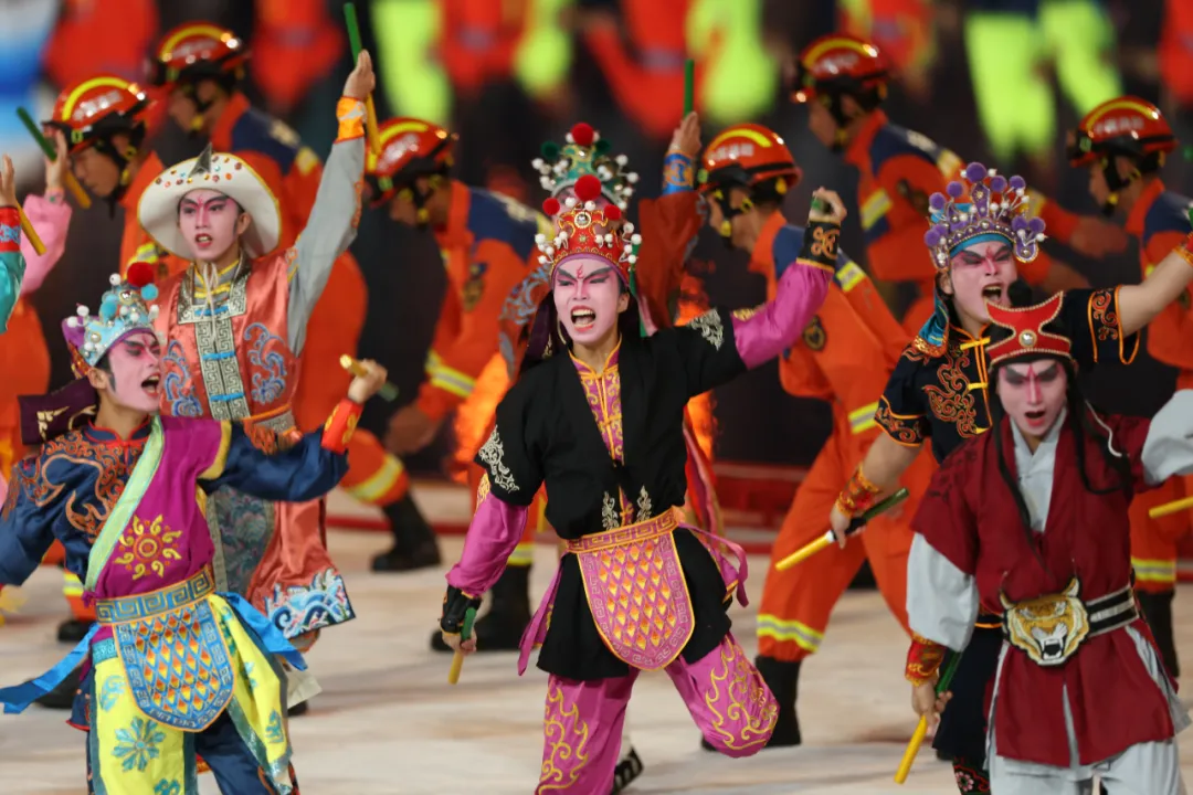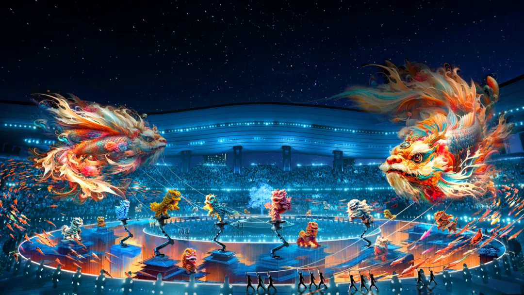 十五运会开幕式通过“同根同源”“同心同缘”“同梦同圆”三大篇章,将岭南醒狮、粤剧水袖、龙舟竞渡、中华战舞等传统文化元素,与人工智能、VR、机器人等前沿科技深度融合,打造出一场“古今对话”的沉浸式艺术盛宴。