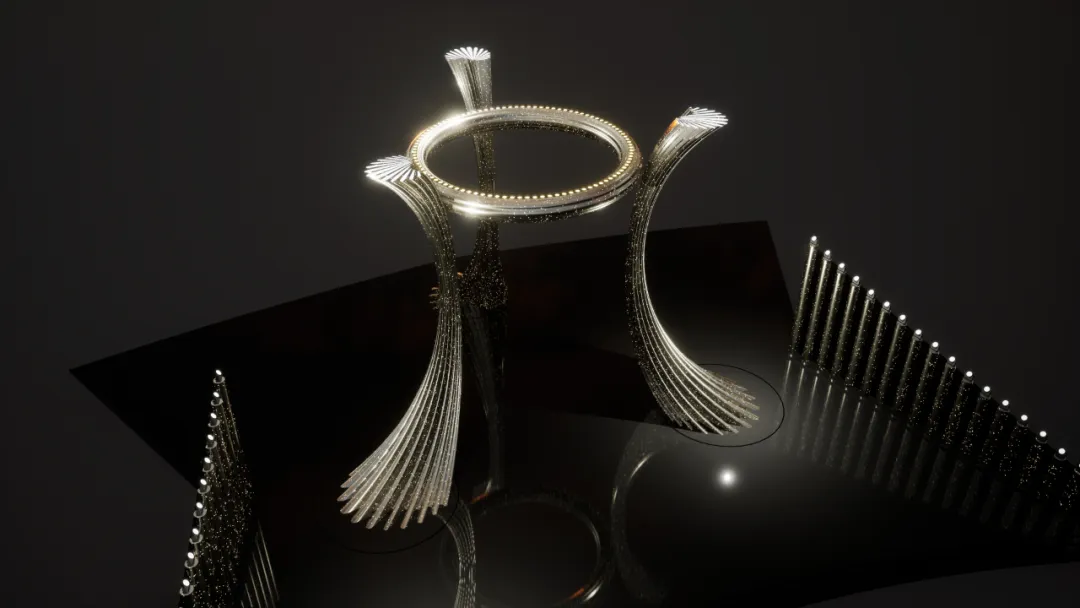 火炬塔的设计更是融合地域象征与动态美学:以三根弧形支柱代表粤港澳,造型源自会徽中的三朵烟花;点火后机械结构运动,最终形成鼎立造型,寓意“鼎立中华”!
