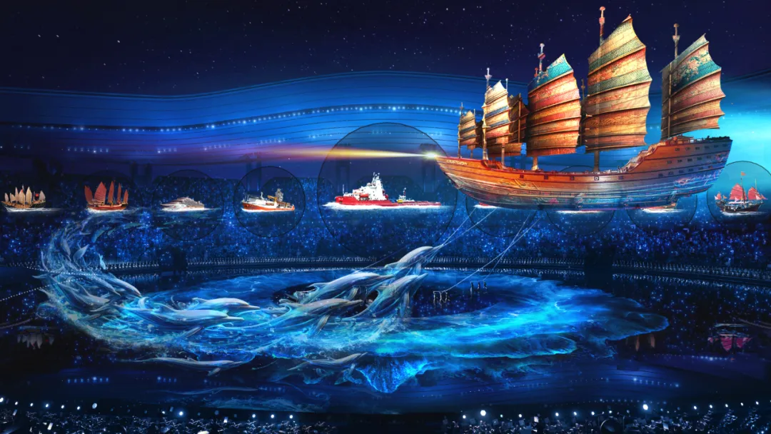 美术总设计 尚天宝介绍,此次舞美设计理念突出“同心圆”与“水文化”,采用中空环形舞台象征“同心圆”,呼应湾区主题;铺设20000平方米水舞台,体现广东海洋文明特色,并利用水面倒影创造空间镜像效果,营造悬浮舞台的视觉错觉。