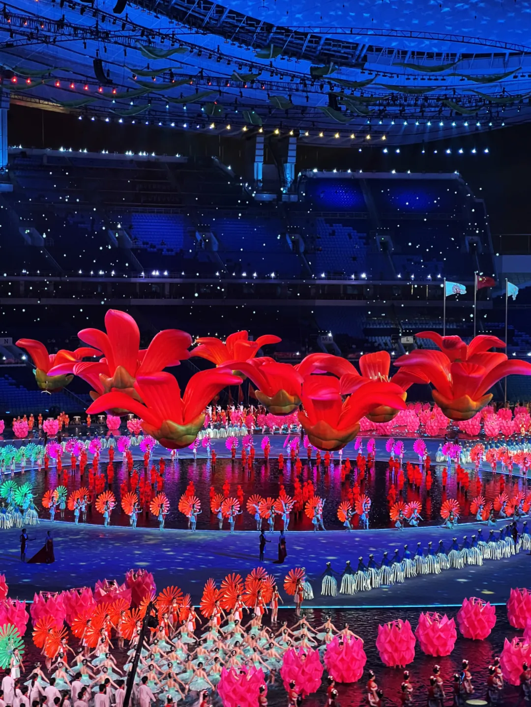 尾声使用15朵象征十五运的木棉花充气装置,在空中自由飘舞。”