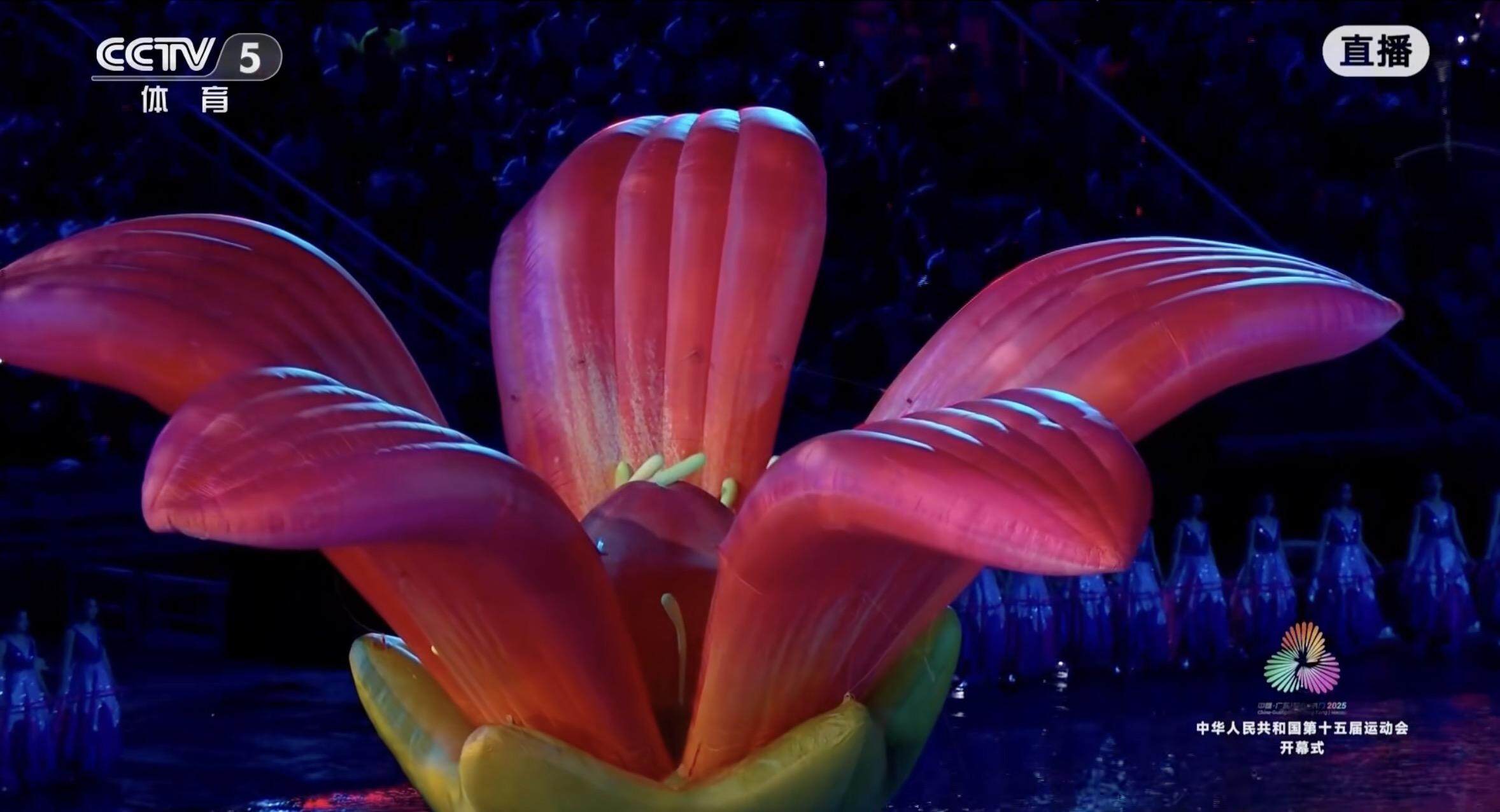 我本人担任了十五运和残特奥会开幕式艺术顾问,参与了核心艺术理念的创作与审定。更重要的是,广州美术学院组建了一个跨学科、跨领域的专家团队,形成了“专家领衔、团队作战”的模式。在开幕式中的大型光动立体艺术装置“木棉花”和“雨打芭蕉”,也是由我的绘画作品转化再创作完成的。