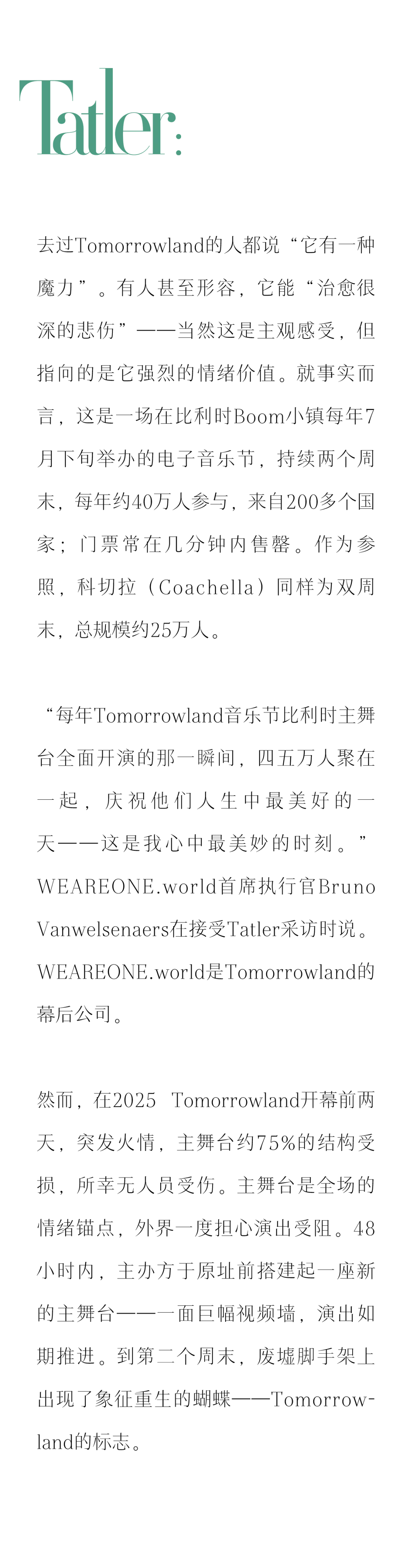 每个人来到Tomorrowland的理由都不一样:有人是为了尽情玩乐,有人是为了听音乐。但当你离开时,带走的是一种“我属于这个整体”的记忆。此后,只要遇到另一个去过Tomorrowland的人,只要听到“Tomorrowland”这个名字,那种频率、那种团结感就会立刻被唤起。