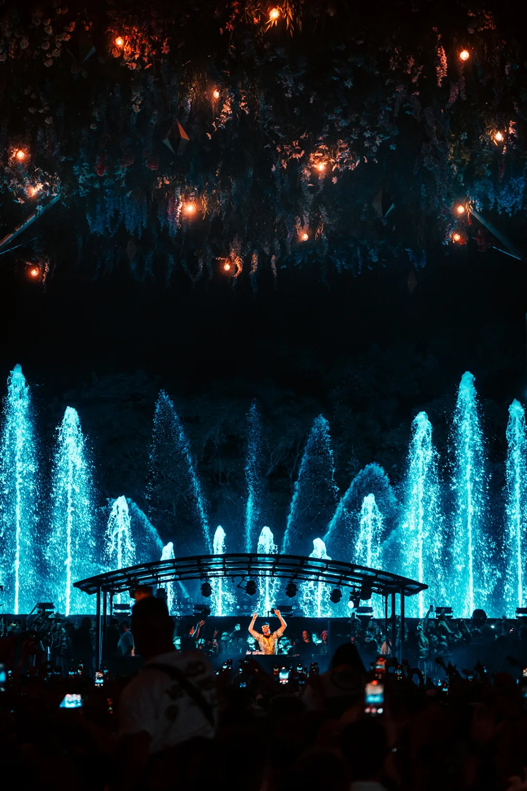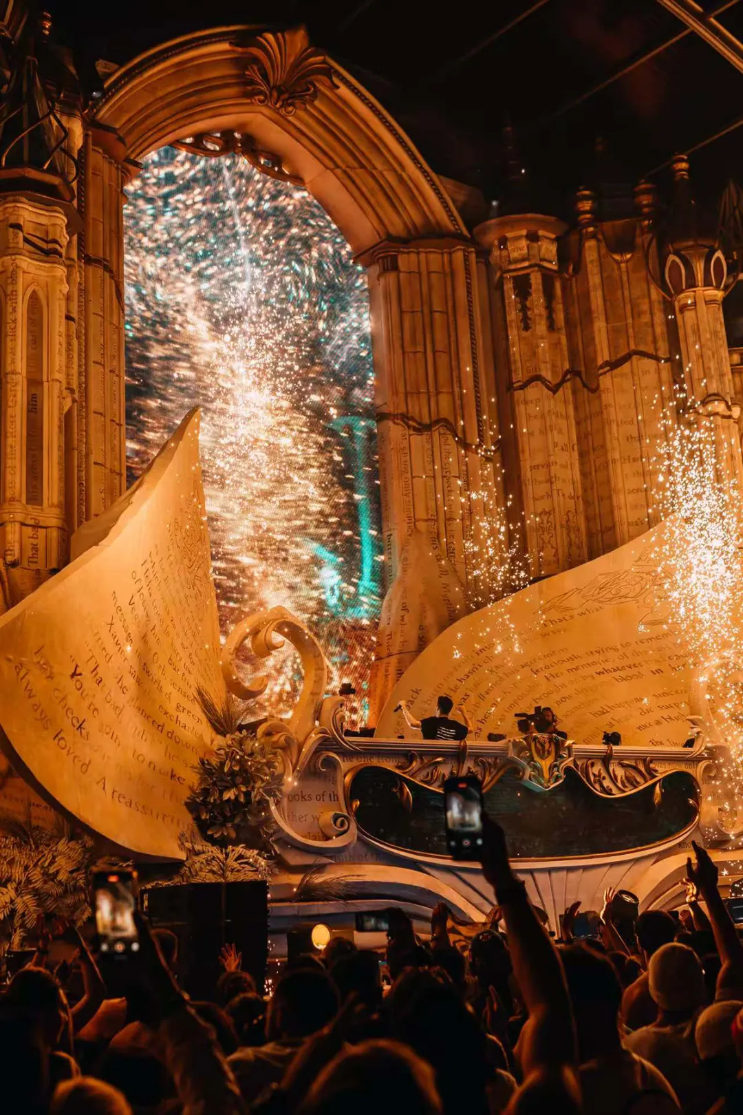 第一,它是音乐节中“奇幻沉浸体验”的代表。在相当于50个足球场的草地上,Tomorrowland把公园改造成一个真正的童话世界:数百位知名DJ在16个充满想象力的巨型舞台轮番登场。以2024年为例,主舞台高36米、宽160米,屏幕有1600m² ,其中包含1054盏灯、43个喷泉。夜幕降临,灯光秀与烟花接力,音乐、视觉与叙事织成一体。