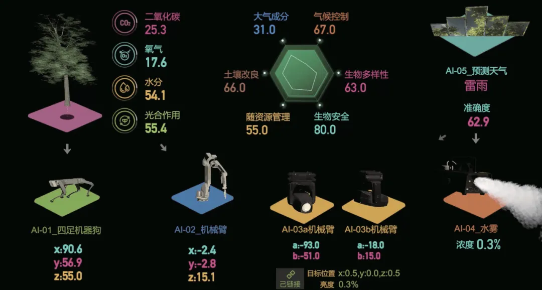 这件作品由多个智能体和非智能体组成,旨在通过高度协调的交互实现树木的持续健康生长。系统的核心是两组植物,其作为非智能体,被智能体如机械臂、机器狗、灯光、烟雾机和天气预测系统监控并维护。机械臂负责调整植物的位置,并与灯光和烟雾机关联,确保为植物提供最佳的光照和湿度条件。机器狗则承担侦察和安全职责,辅助机械臂照料植物,并对环境进行监控。灯光智能体根据需要自动调整光线方向和强度,而烟雾机则根据环境和机械臂的反馈调整湿度供应。天气预测系统提供未来天气情况预报,帮助其他智能体优化植物养护策略。所有智能体之间的互动都围绕着植物的健康生长需求进行优化配置和相互支持,以实现系统的综合功能和目标。此外,这个系统与观众互动通过机器狗的视野而实现,机器狗根据观众的集体行为而改变自身决策,从而影响并调整智能体间的协作状态。
