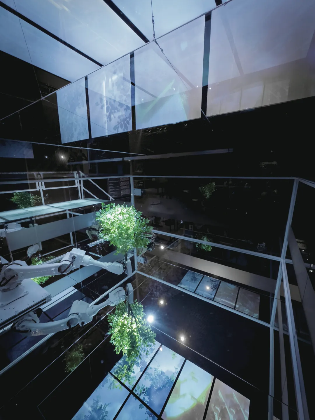 笔者利用数字世界创造出一层隔阂,一个界面。透过此界面,可以看到南极冰川消融,却听不见冰川崩塌的巨响。在关切、构筑并审视数字世界之后,深入反思自己所处的真实世界与虚拟世界交叠下的扑朔迷离,由此创作者构思出了《智能体共生》中那棵特殊的树。它或许代表了笔者,或者是任何人,它身处重重迷雾之中,出现在一个浪漫而又哀伤的场景里。在《智能体共生》中,树不再扎根于泥土,而是被程序控制的机械臂裹挟。在这个由AI驱动的环境中,因优先考虑树木的健康状况和生长诉求,而无视了树木真实的需要。笔者特意去除了防止对树木造成伤害或不良影响的规则,并故意设置了“错误”的参数——树木对阳光和水分的需求和获得频率来自人为规定。这使得当机械臂过于频繁地抬升或降低时,树木将承受巨大的压力。机械臂代表数字世界的内在逻辑,或许在潜移默化中已经撼动了人之为人的根基。直到最后,树枝折断,叶片散落一地,迷雾逐渐散去,机械臂还在一如既往地运作,但那棵树已经消失不见。这样的叙事场景,展现了人类与其所创造的科技世界之间复杂而微妙的关系。