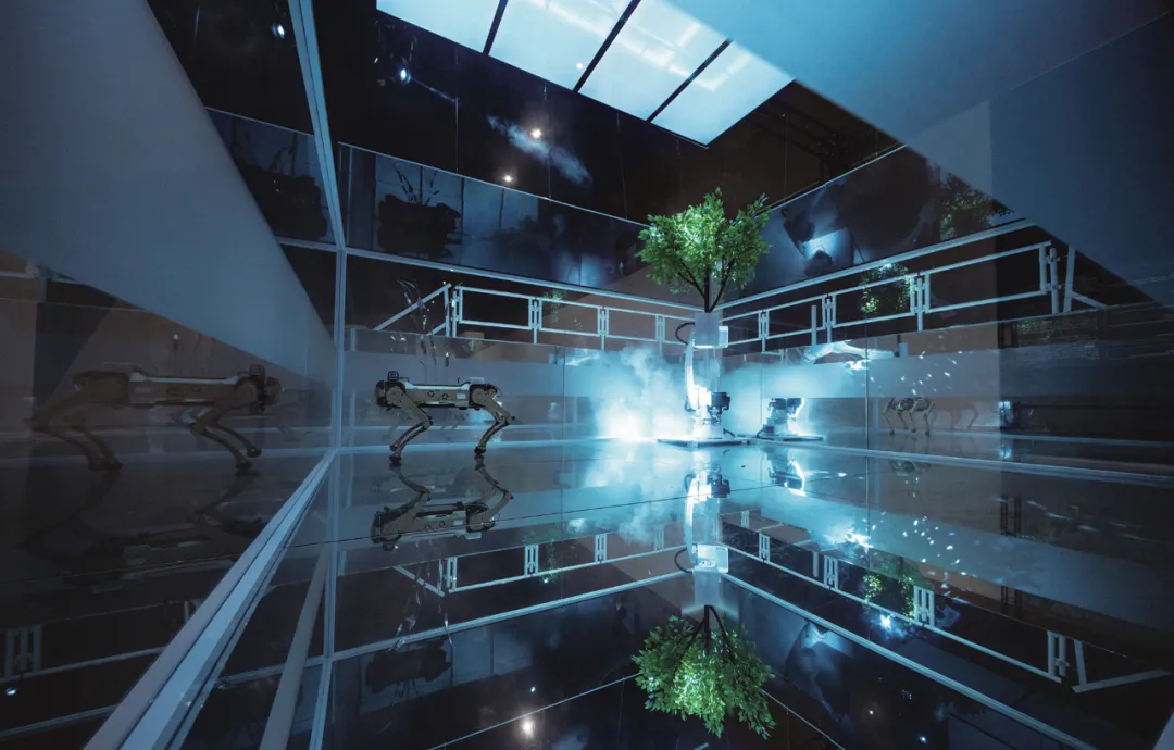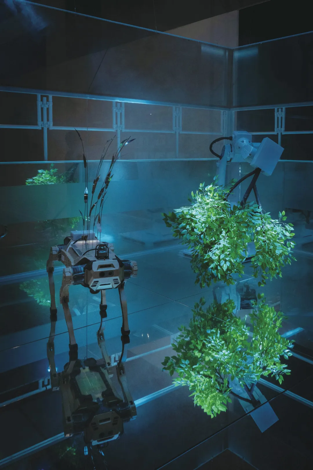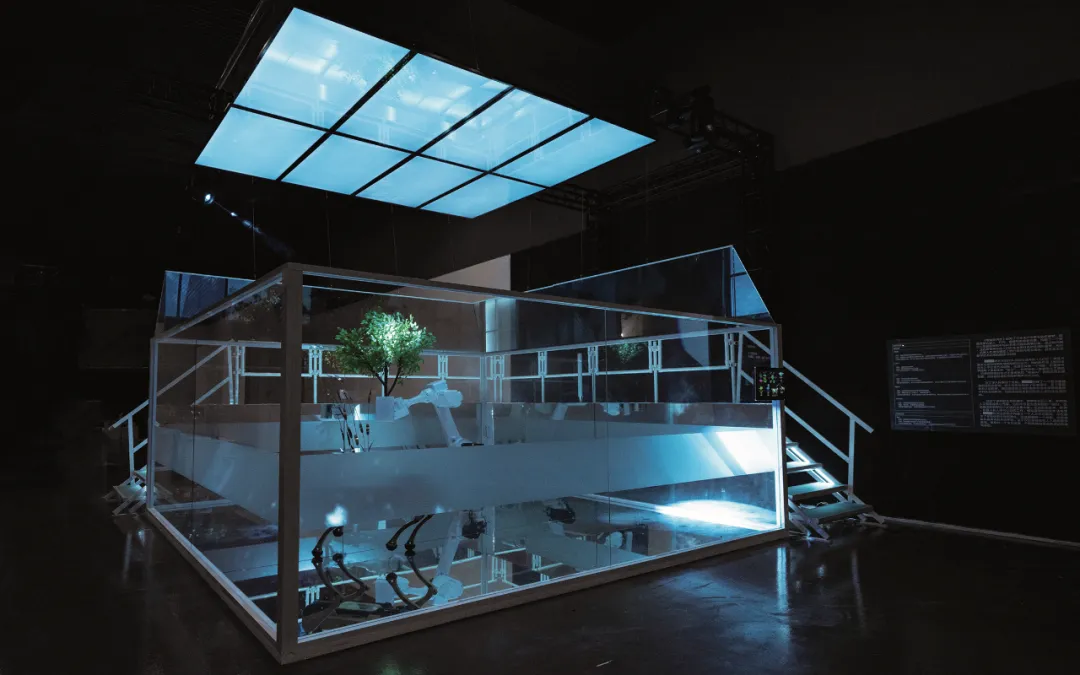 ▼图1 陈抱阳 《智能体共生》 多智能体装置(机械臂、机器狗、灯光、烟雾、屏幕) 6m×6m×2m 2024▼