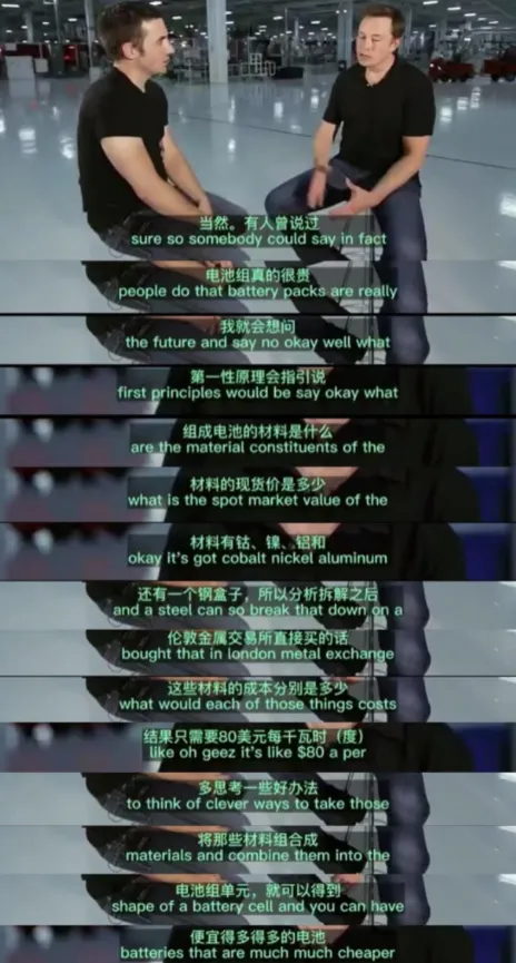 从事物本质的基本要素进行思考,比如马斯克在面对“传统电池成本高,所以新型电池更昂贵”的行业惯例时,他从电池的基本组成成分钴、镍、锂等元素思考,去计算原材料成本与加工成本。