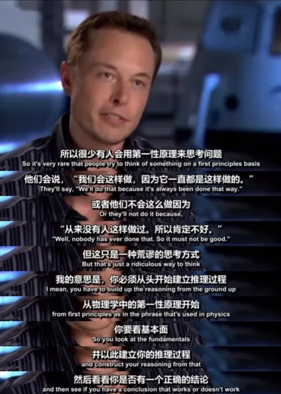 简单给不熟悉的同学介绍一下“第一性原理”,它本质是让我们将事物拆解到最基本的“公理”中,然后从零开始重建。近几年因为马斯克等创新者的推崇,成为一种很重要的招聘与人才判定条件。