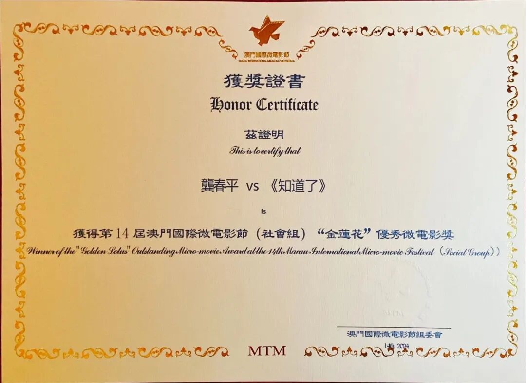 - 文旅纪录片《知道了》斩获澳门国际电影节“金莲花”奖