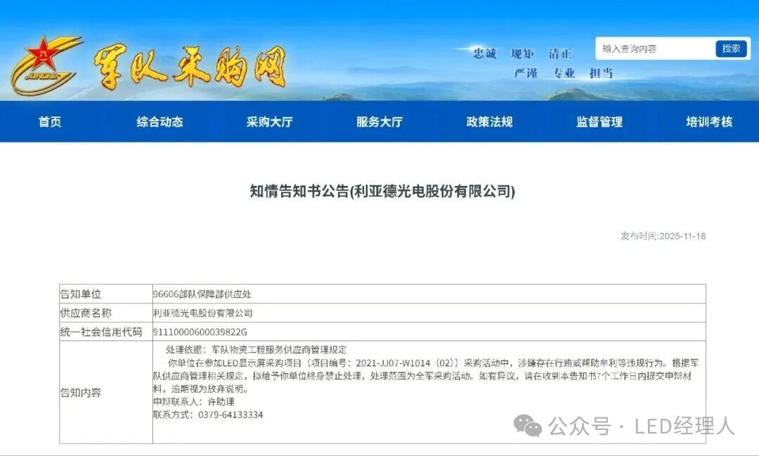 “利亚德光电股份有限公司,因涉嫌行贿或帮助牟利,拟被终身禁止参加全军采购活动。”
