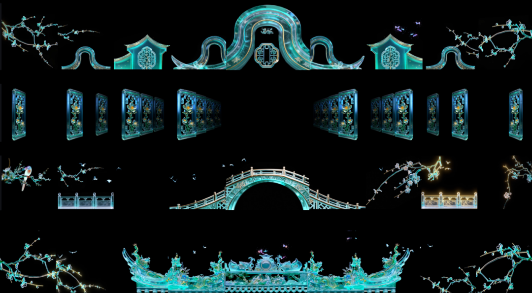 戏曲段落中,地面画面用作水的意象,以呼应传统建筑中的院落水景、桥与亭榭,其多以木结构、柱顶屋檐形式,配有池塘营造流动,以体现“天人合一”的美学理念。