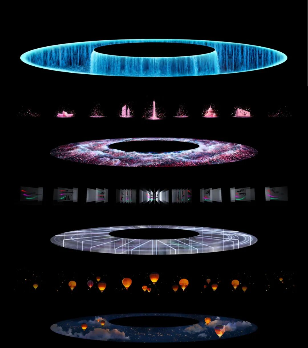 快速运动的图像借助人眼的环视效应,以“聚”的向心力来引导视线,实现多屏视觉整合;同时保留各屏局部独立,通过海浪向外扩散的节奏生成“散”的离心张力,为观众的选择性聚焦留出空间。用一收一放、一聚一散的节奏,来消解视觉的割裂,同步时间与空间的叙事层级,从而呼应“环”的整体概念。