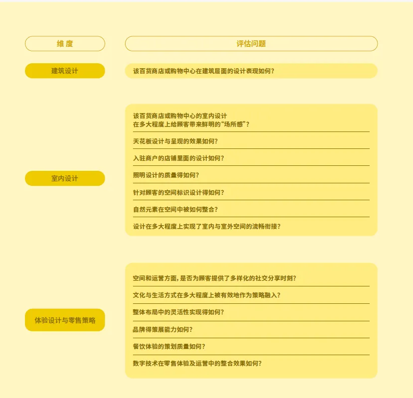 设计评分系统分为建筑设计、室内设计、体验与策略三大维度,共14个细分指标。这一体系是我多年观察全球零售项目后逐步建立的框架。