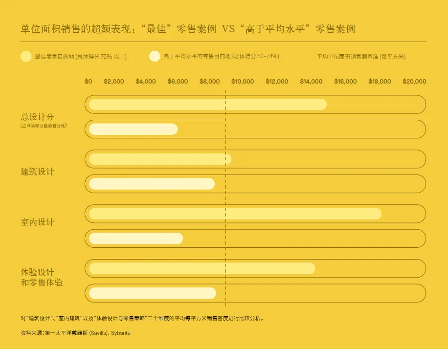 他们共同对全球23个标杆零售项目进行五分制打分,结合每一个零售目的地的销售额,研究发现设计出众的项目销售密度平均高出行业水平70%,在室内设计的类别中,清晰高质量的导视设计对销售表现的影响最为显著——在该维度得分最高的案例,单位面积销售额比平均水平高出86%。同类别下,场所感的营造、天花板的设计和店面设计也同样体现出了强关联。