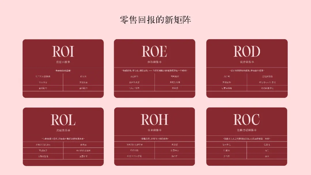 基于此,Sybarite提出了一个超越财务指标的新“回报矩阵”,包含六个核心维度,重新诠释了零售中的ROI(投入回报产出)概念,将其拓展为多维价值体系:投资回报(ROI)、体验回报(ROE)、设计回报(ROD)、忠诚回报(ROL)、传承回报(ROH)以及社区回报(ROC)