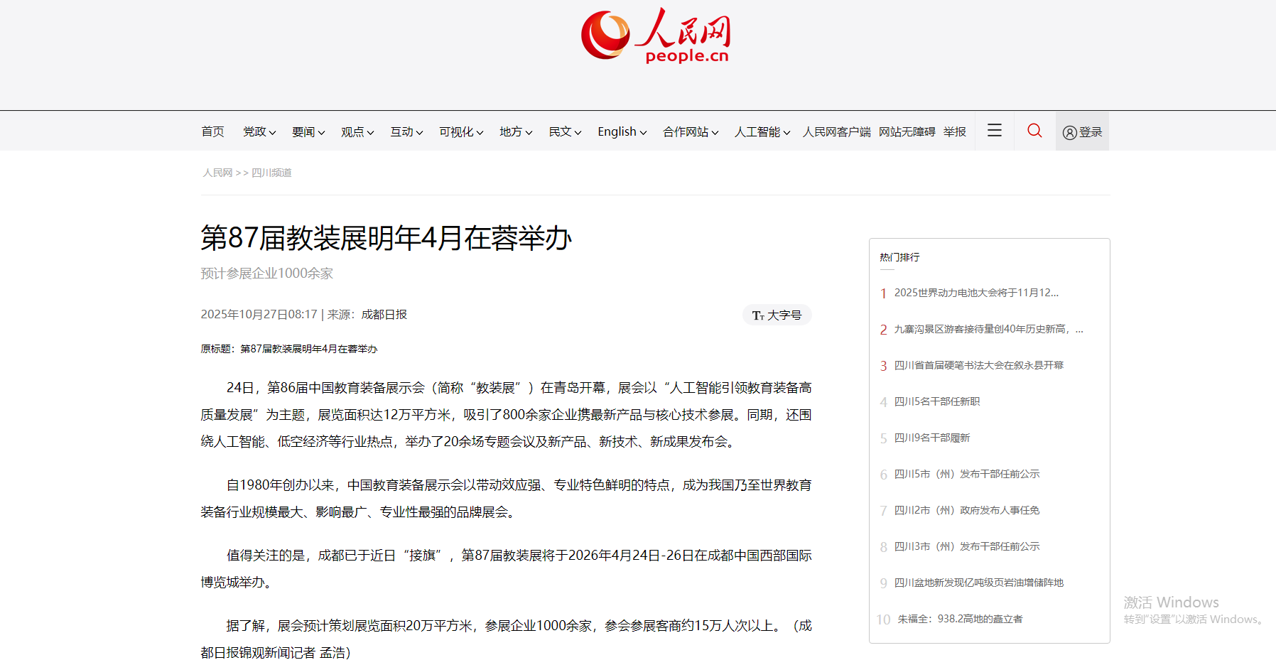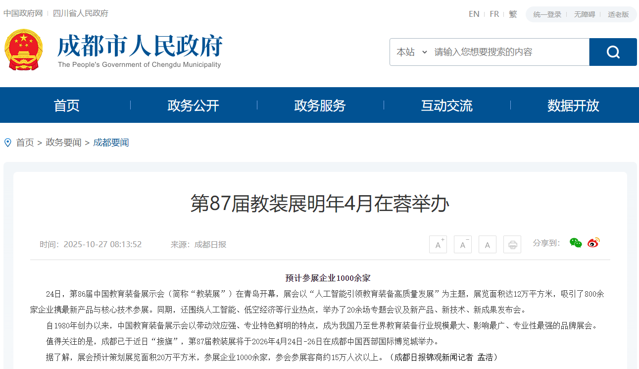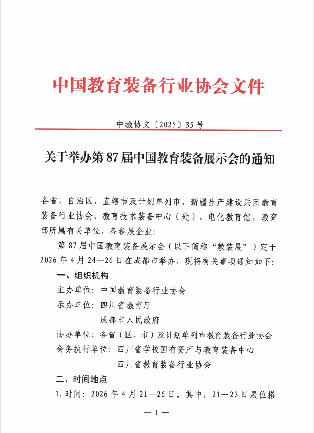 由中国教育装备行业协会主办,四川省教育厅、成都市人民政府承办的“第87届中国教育装备展示会”,将于2026年4月24日-26日在四川成都中国西部国际博览城国际展览展示中心隆重举行。在此,我们向全国各地教育界的同仁、教育装备生产经营企业的朋友们,以及所有关心教育事业的各界人士,发出最诚挚的邀请!