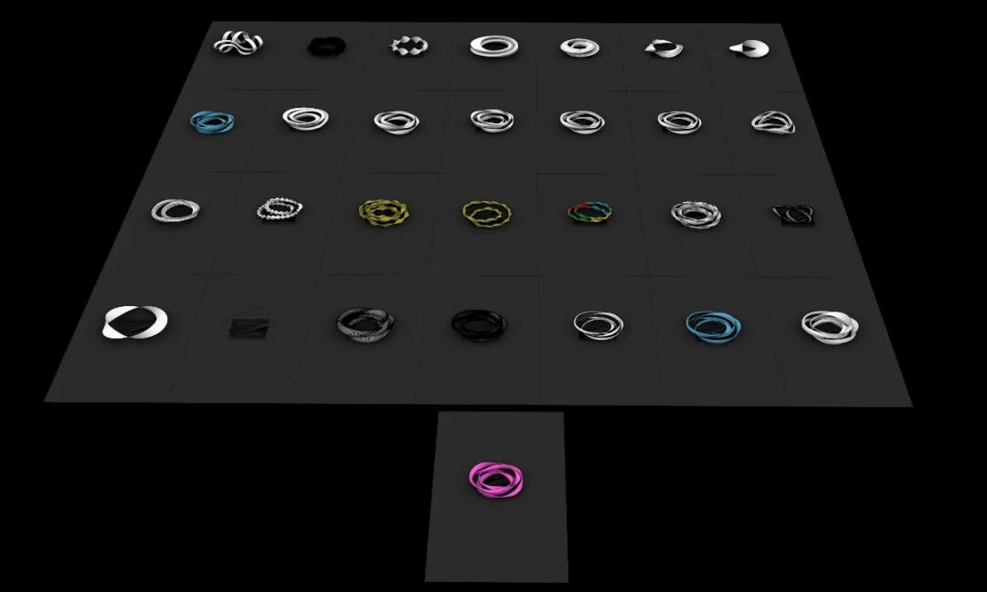 在这次创作初期,莫比乌斯都是单环形式,虽具数学上的完美性,但在真实空间中显得平面、简约,缺乏体量感。直到某个夜晚,双环嵌套的结构在三维空间里意外浮现,其旋转与反转轨迹仿佛自行生成,形态流动了起来。它不是演算的结论,而更像是创作中最不可控但最关键的片刻——灵感的出现。
