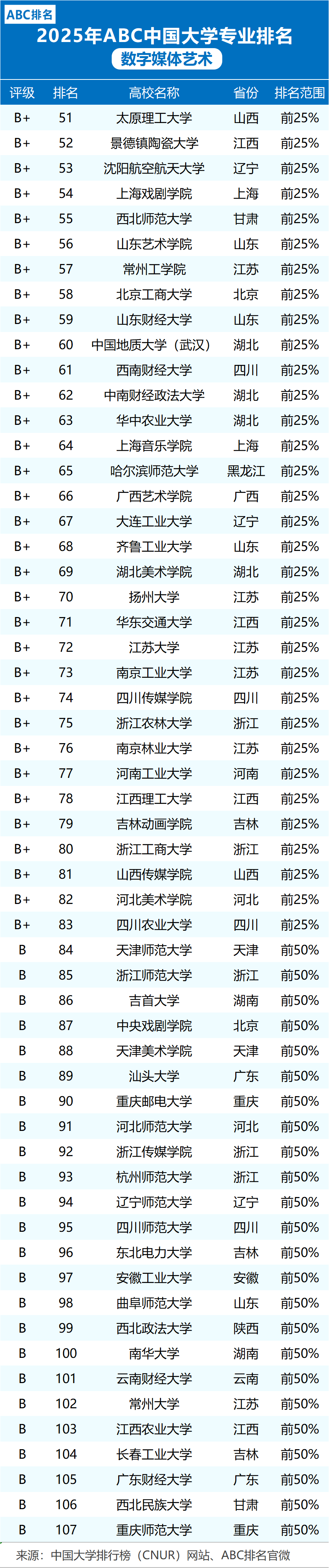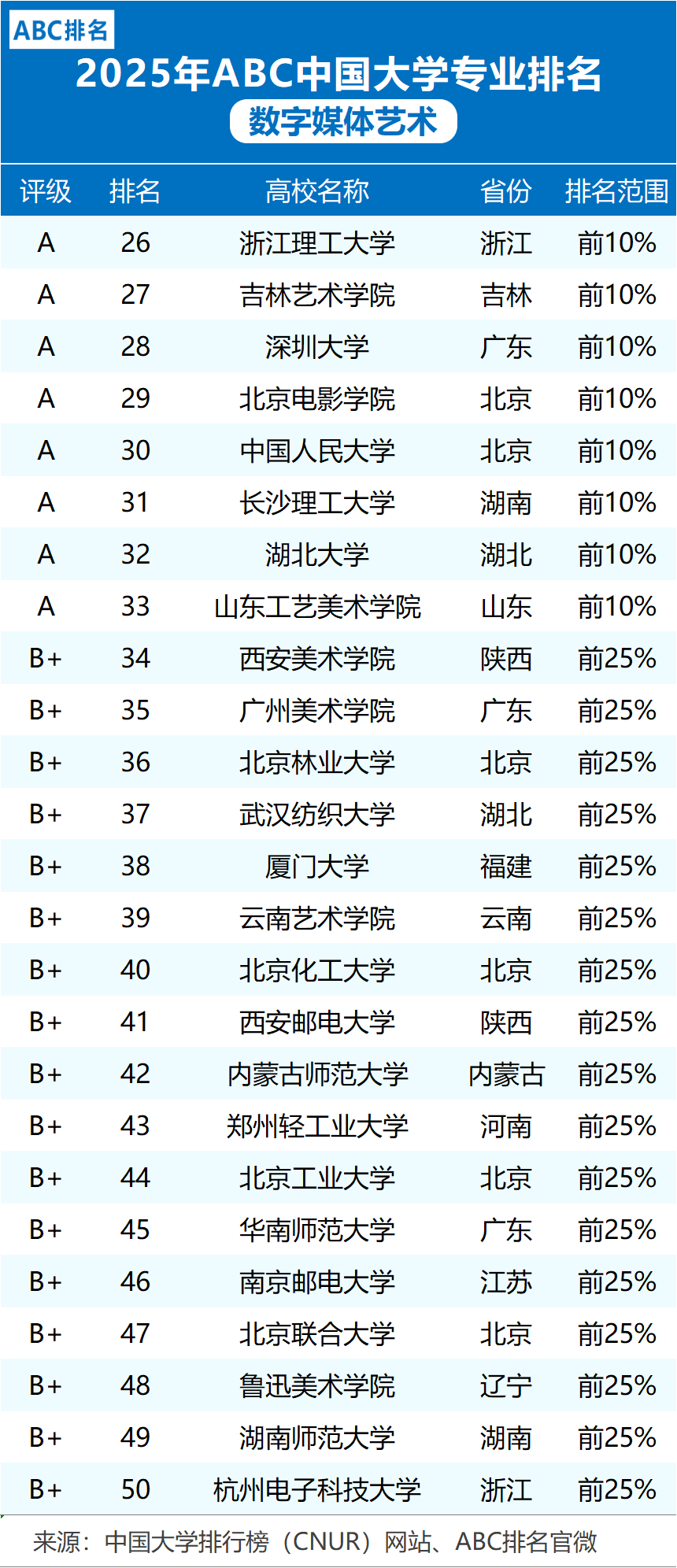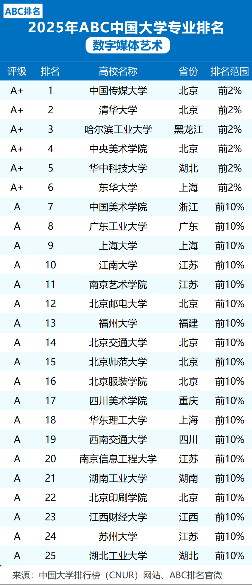 6月6日,中国大学排行榜(CNUR)网站正式发布了《2025年ABC中国大学专业排名:数字媒体艺术》。