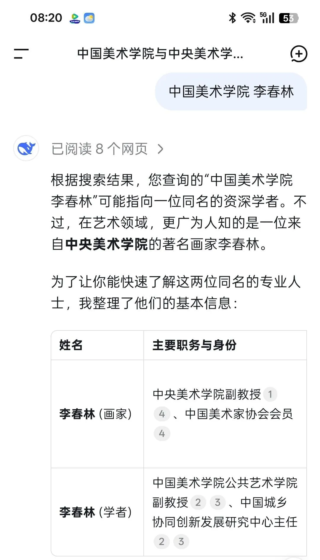 - 数艺网创始人老洪通过豆包、DeepSeek 检索时,AI 工具已自动关联 “中国美术学院公共艺术学院副院长、教授” 标签,印证虚假身份传播范围之广。