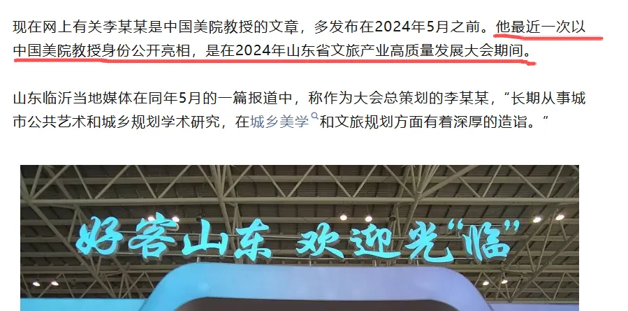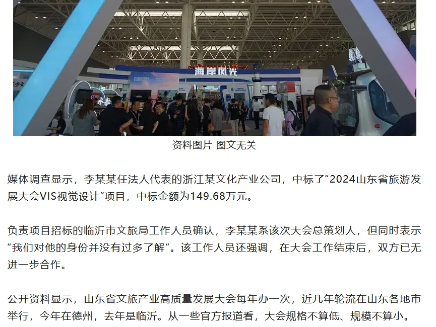 2024 年 4 月:以 “中国美院教授” 身份担任山东省文旅产业高质量发展大会总策划,其公司中标 149.68 万元 VIS 设计项目;