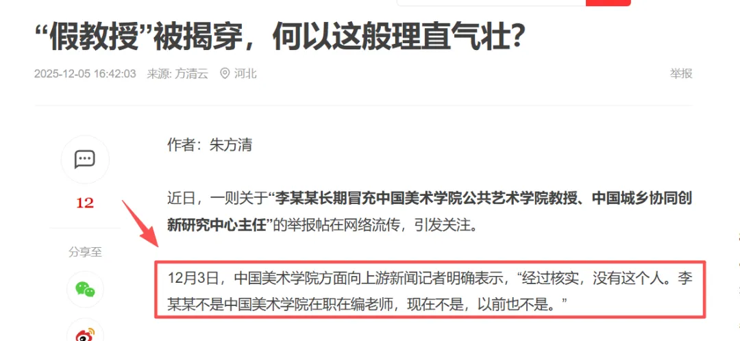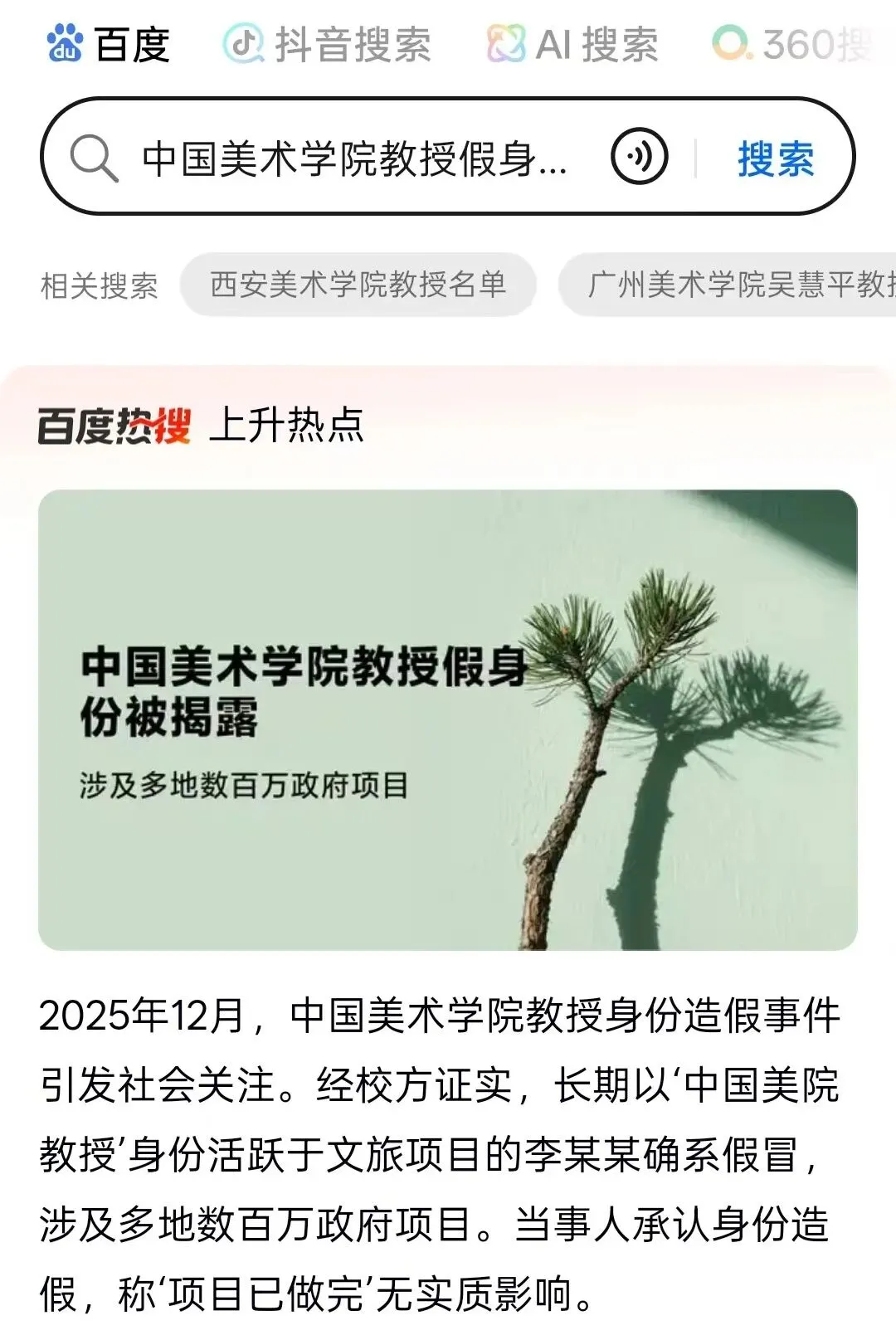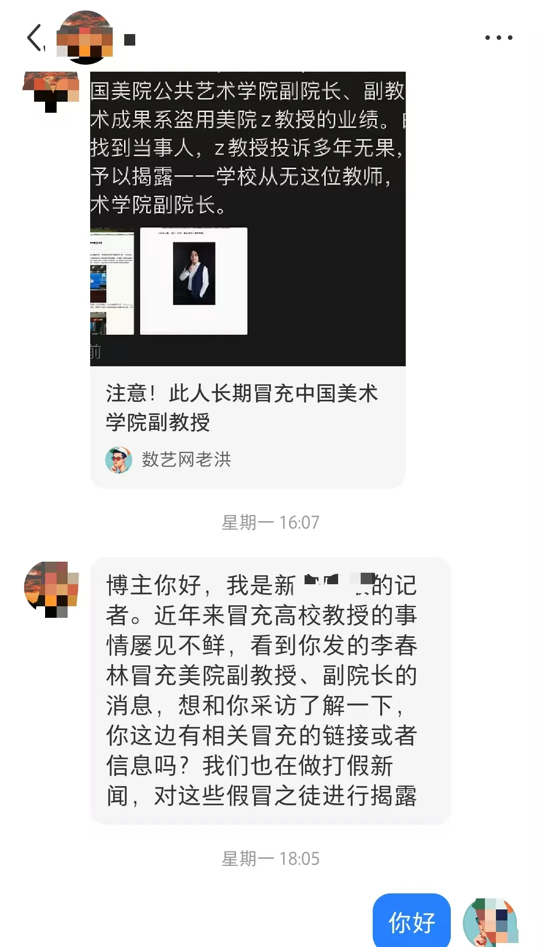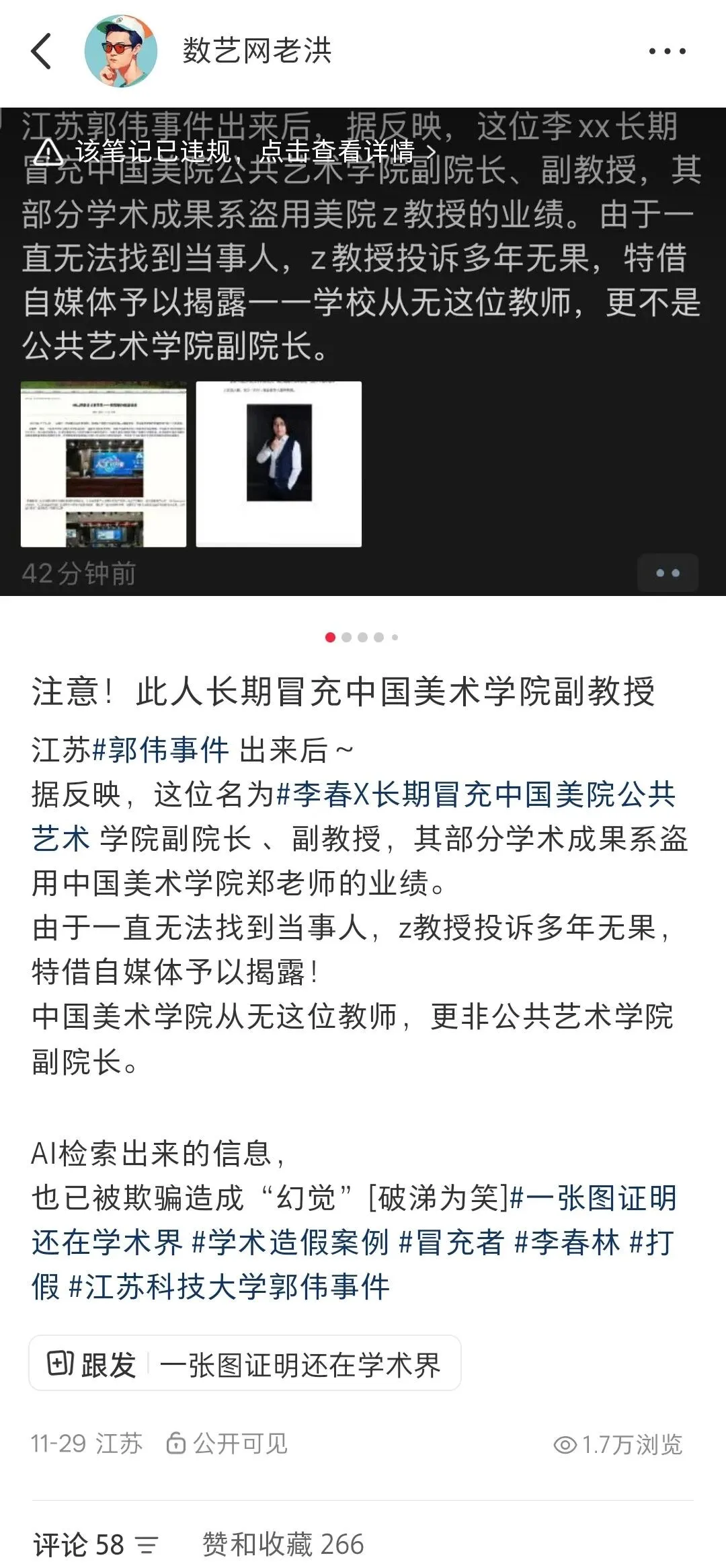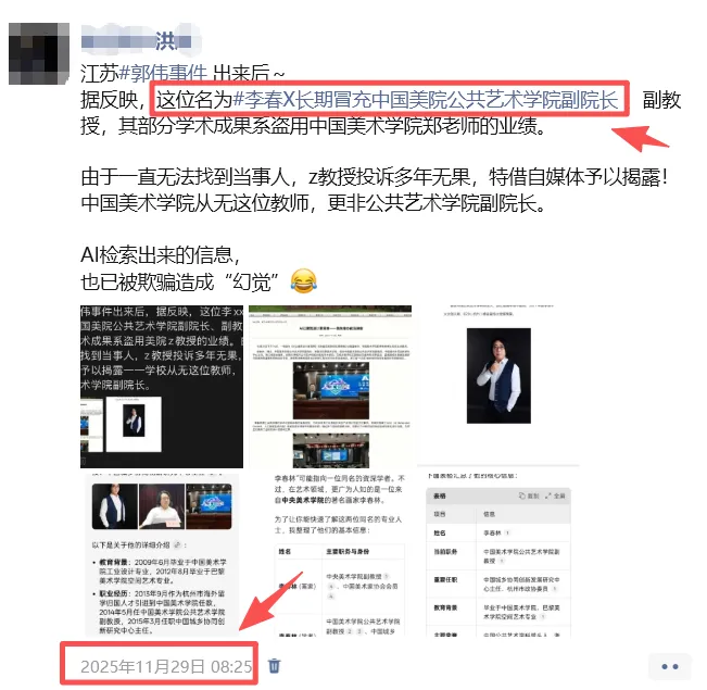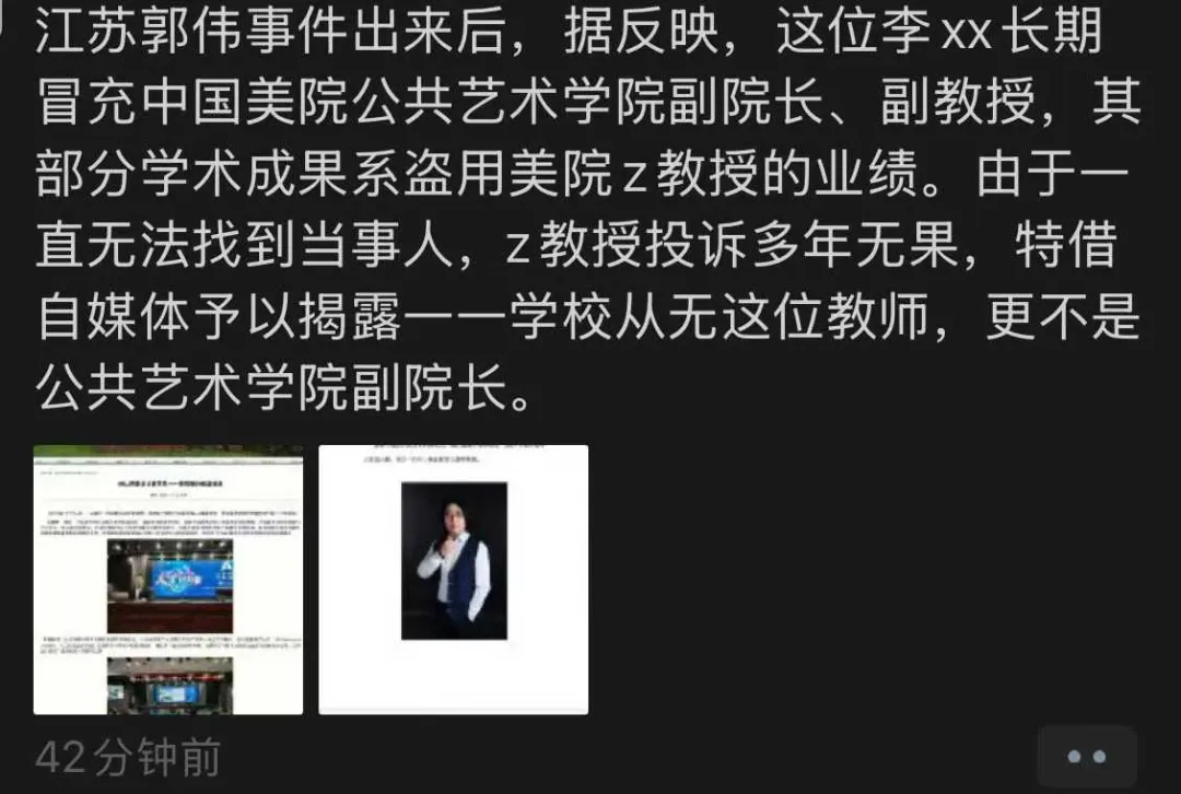 2025 年11月28日晚,数艺网创始人老洪在微信朋友圈看到现任中国美术学院工作人员的揭露内容,明确指出 “李 xx 长期冒充副院长、副教授,部分成果疑似盗用美院Z教授业绩,学校从无此人”。