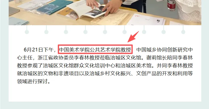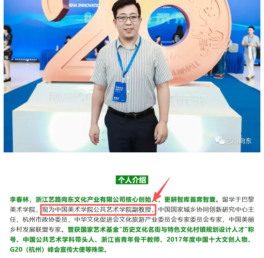 - 浙江艺路向东文化产业有限公司(李春林为法定代表人)过往宣传中,始终以 “中国美院关联身份” 背书,强调 “依托美院学术资源” 开展城乡文旅项目;
