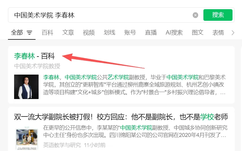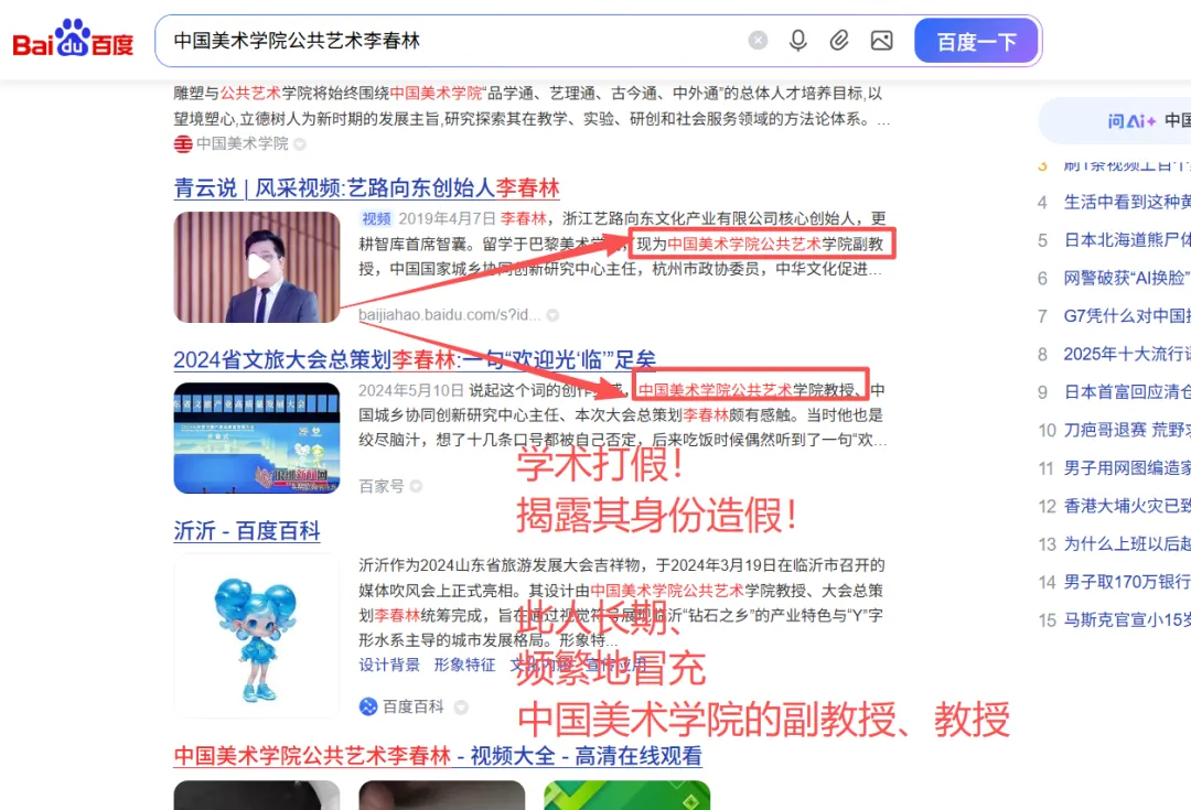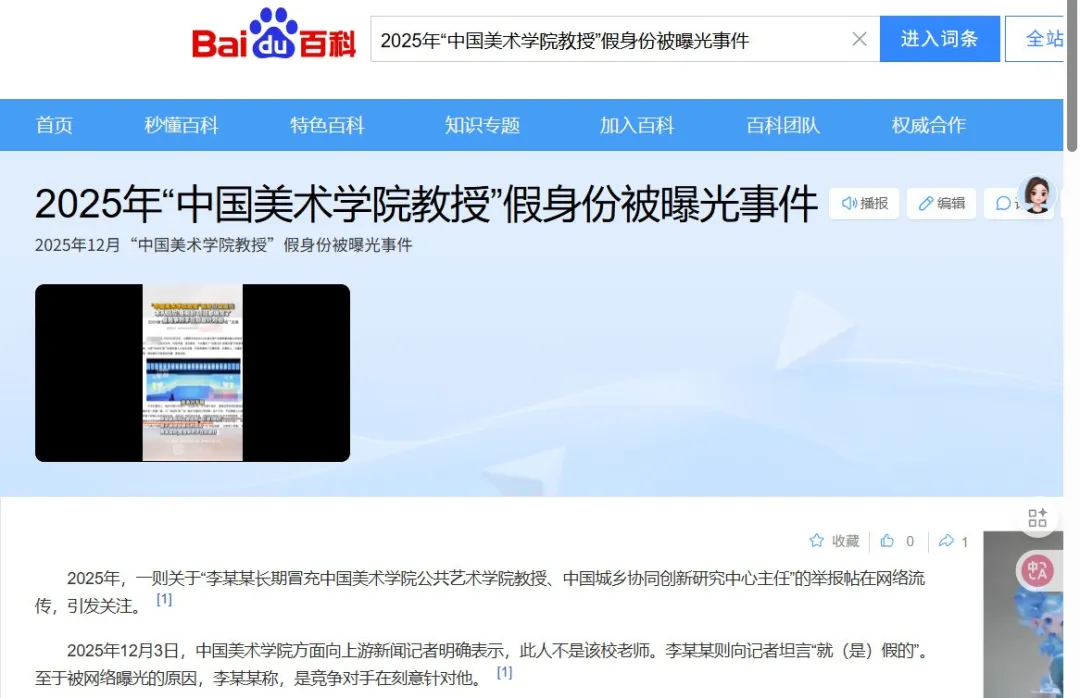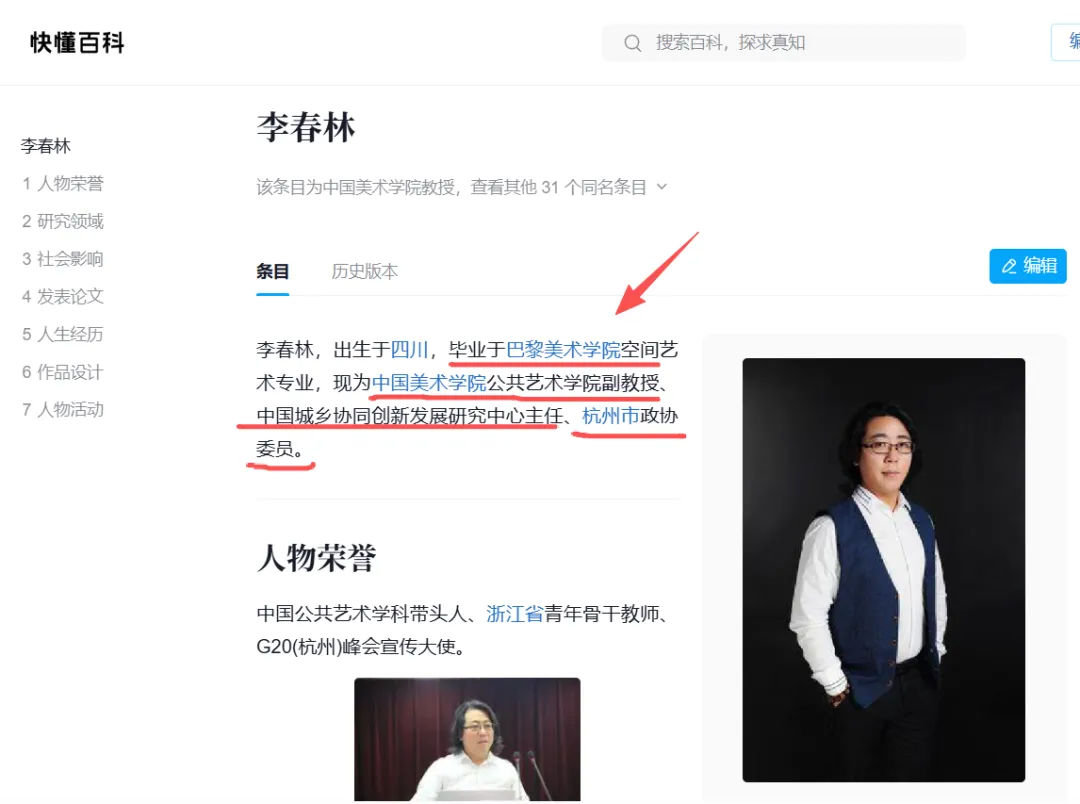 - 抖音百科曾收录 “李春林(中国美术学院教授)” 词条,虚构 “2013 年作为海外归国人才引进到中国美院任教”“2014 年任副教授” 等履历,还罗列参与上海世博会中国馆设计、G20 杭州峰会城市美化等虚假成果,该词条目前仍可检索(发布于 2025年2月13日);
