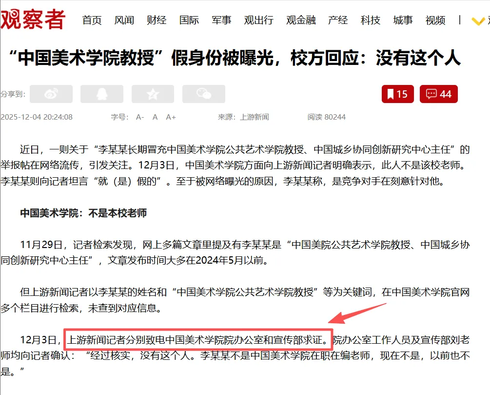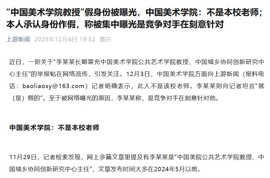近几天,一则关于“李某某长期冒充中国美术学院教授/副教授、虚构‘公共艺术学院’副院长、中国城乡协同创新研究中心主任”的事件引发了强烈的关注。