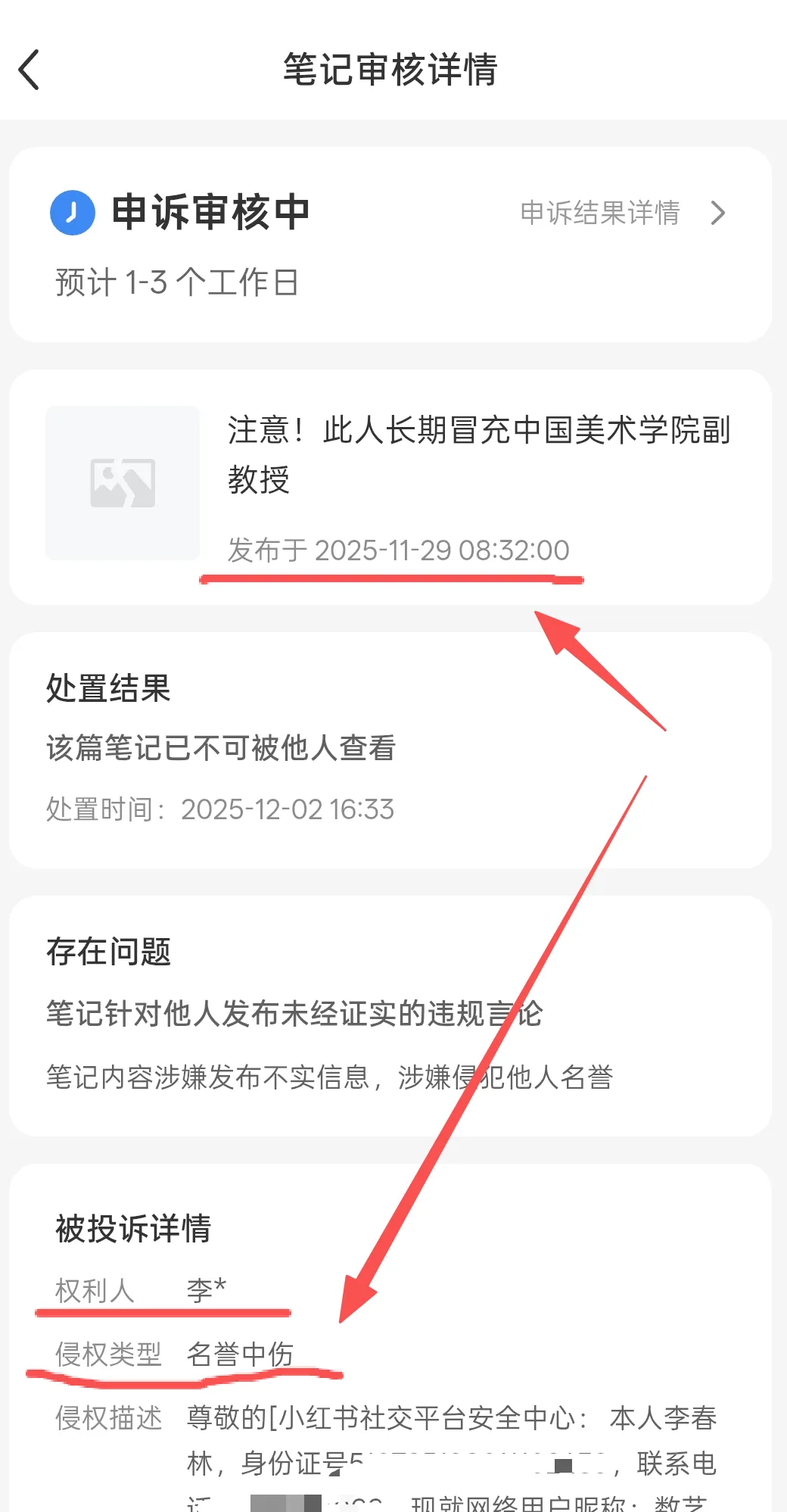 - 通话结束2小时后:该笔记被李春林以 “名誉中伤” 投诉下架,老洪申诉因 “需校方出具权属材料” 暂未通过,但持续向媒体提供线索,推动官方调查。