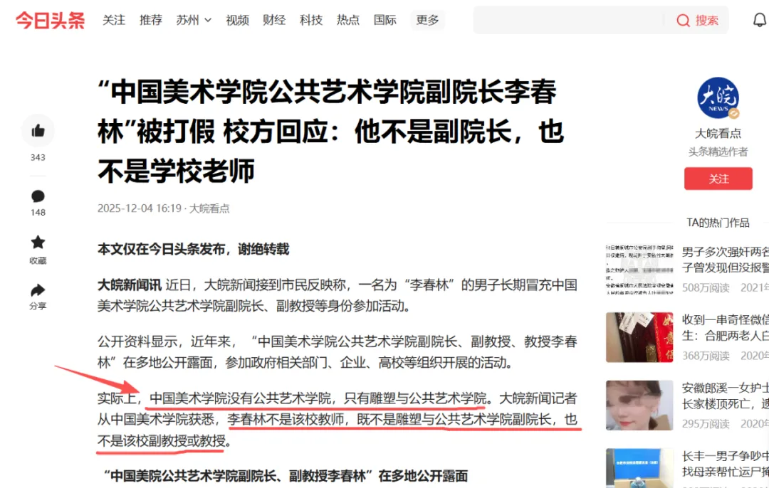 这一举动极大可能的直接推动了该事件发酵与官方调查的“导火索”。随后几天,经大皖新闻、上游新闻等权威媒体核实,中国美术学院官方也明确回应 “李春林从未在校任职”,其虚构身份已用于多省市文旅项目合作,涉及金额超百万元。