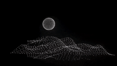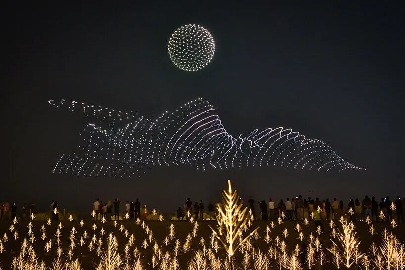 《Wind of Change》运用2000架协同飞行的无人机,在朱拜勒岛的红树林上空徐徐展开,它们的飞行轨迹描绘出无形的自然力量:风向的变化、海洋的运动以及沙丘的雕琢。