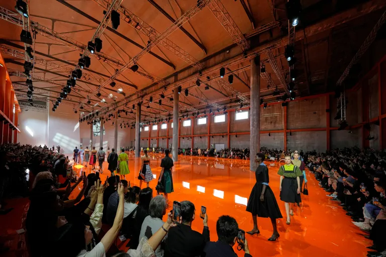 当地时间9月25日,Prada 2026春夏系列发布秀在老地方米兰 Prada 基金会上演。作为 Prada 的长期合作伙伴,该展场由雷姆·库哈斯的 OMA 建筑事务所设计。穿过橙色的海洋,Prada 的女装走来,她们身着专为“转变、改变和适应”而设计的服装。