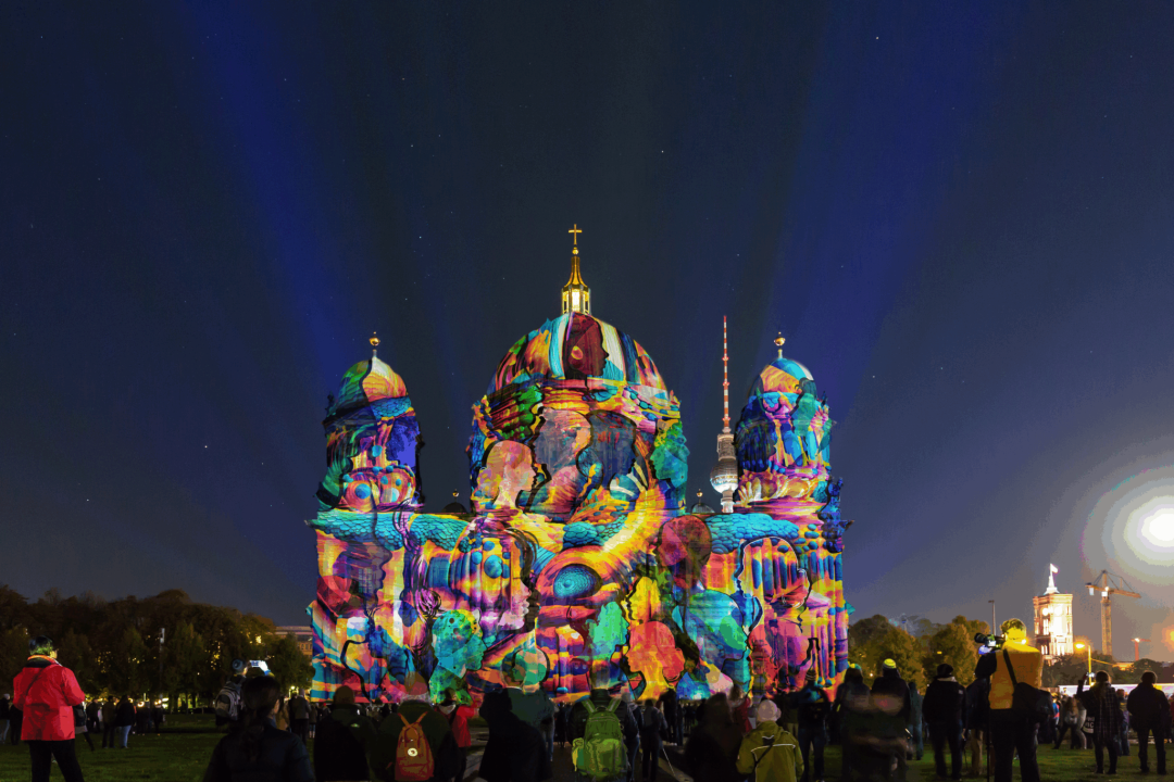 柏林大教堂披上流动的彩幕,勃兰登堡门化作巨大的画框,胜利纪念柱像一支发光的火炬......来自18个国家的国际艺术家们在这里挥洒创意,把“Let’s Shine Together”(让我们一起闪耀)的口号写进夜空。