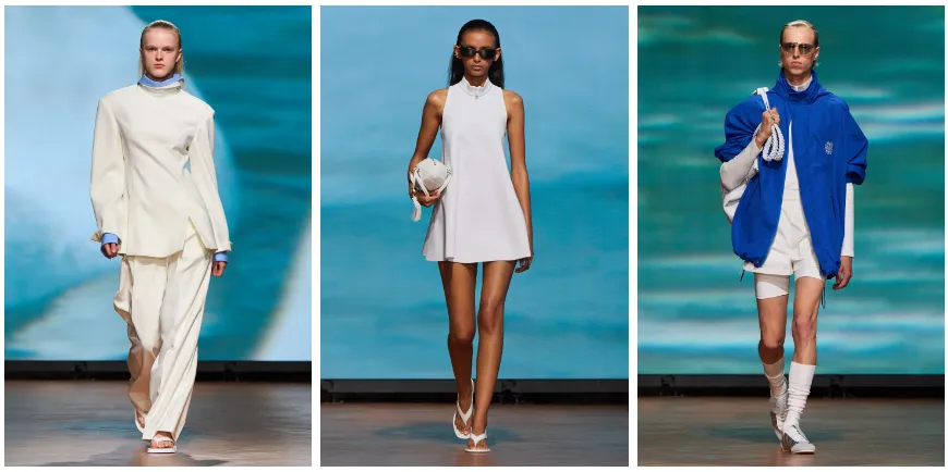 本季大秀通过 Marc Newson 创意构思的舞台,呈现了一个以 “奇幻视角” 看待未来夏季的设计语言,几何色彩、流动感的剪裁和正负空间的交织带来了视觉上的冲击。