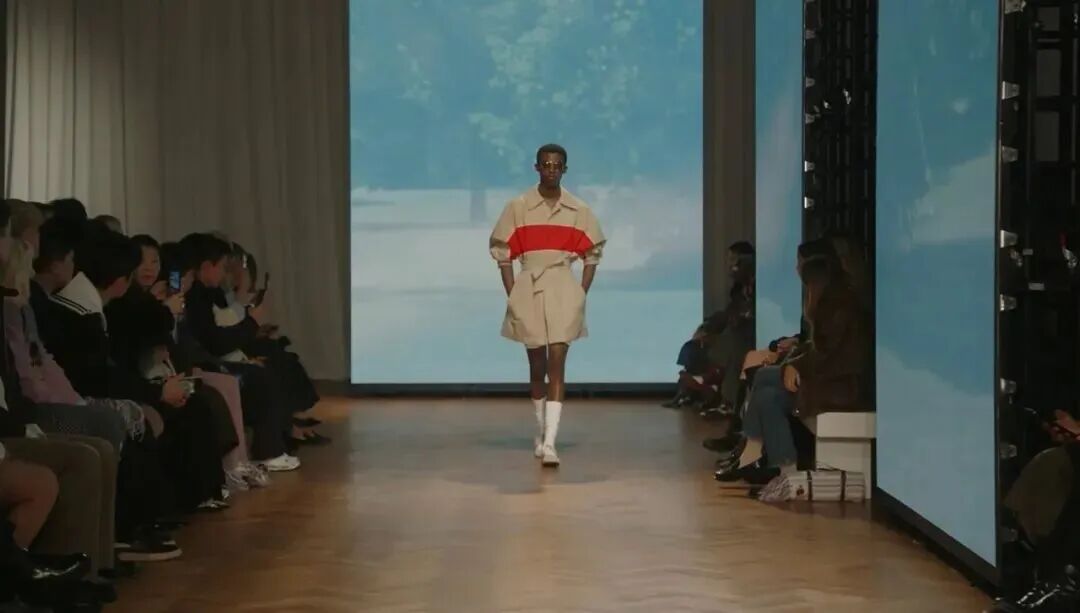 秀场布置同样与本季主题相契合。绿色投影覆盖四壁,仿佛把观众置身于一片流动的城市花园。光影交错间,模特们在宛如公园草坪的舞台上缓缓走出,伴随 Erland Cooper 现场的音乐,营造出既沉浸又诗意的观演体验。