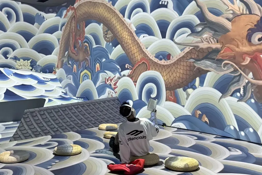 从新石器时代的质朴几何,到唐宋的雍容华贵,再到明清的精巧雅致,千年丝绸纹样演变史如画卷流淌指尖,宋锦的缠枝莲纹在足下蔓延绽放,缂丝的金龙仿佛穿屏而出,环绕身侧。