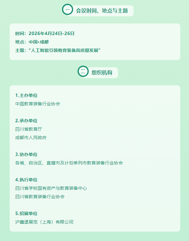 由中国教育装备行业协会主办,四川省教育厅、成都市人民政府承办的“第87届中国教育装备展示会”,将于2026年4月24日-26日在四川成都中国西部国际博览城国际展览展示中心隆重举行。在此,我们向全国各地教育界的同仁、教育装备生产经营企业的朋友们,以及所有关心教育事业的各界人士,发出最诚挚的邀请!