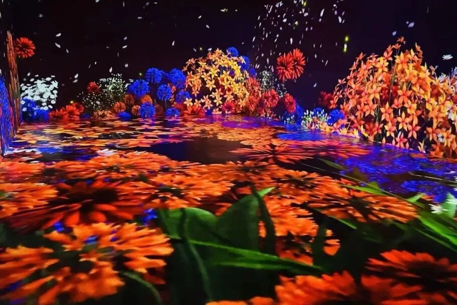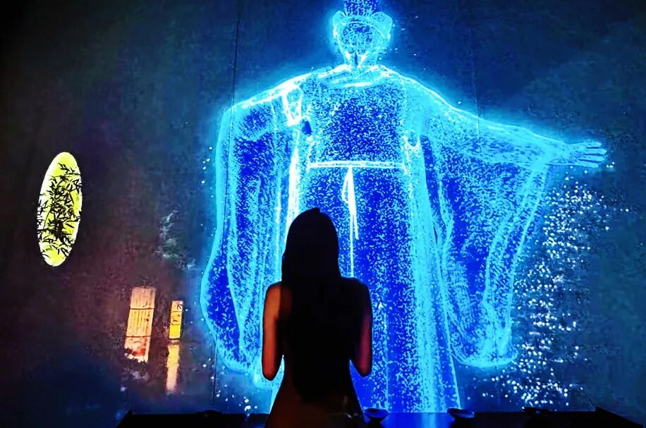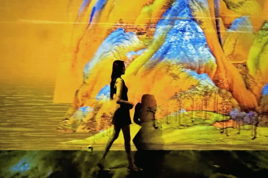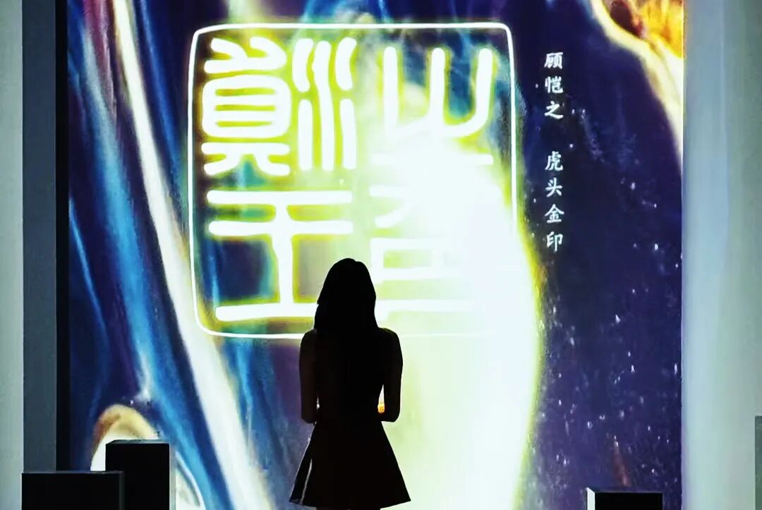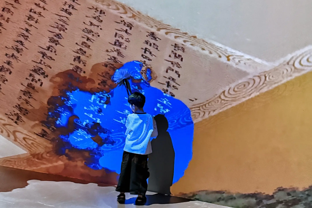 展览汇聚传感技术、显示技术、虚拟引擎、人工智能等前沿科技力量,将静态的书画作品转化为动态的视觉盛宴。“印启万象”通过13枚虚拟印章,为你开启奇幻的艺术之旅;在“入境赋彩”单元,《千里江山图》的画卷会随着你的脚步移动而流淌变化,仿佛你真的行走在山水之间;“曲水流觞”区域与"王羲之"对饮吟诗,体验古人雅趣。