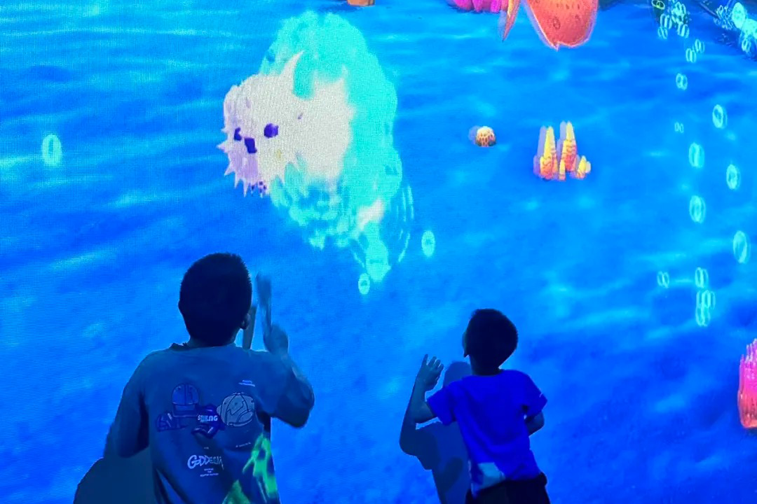 “无界丹青”包括九个主题单元,观众化身“执笔人”。“入画三分”让孩子们的涂鸦瞬间充满生机,融入艺术画卷;手握巨型毛笔在“挥墨绘影”区域内上尽情挥毫泼墨,体验一把书画大师的创作乐趣;“潘多拉”创意空间则让孩子们能为小鱼涂色,并看到它们在大屏幕上畅游。