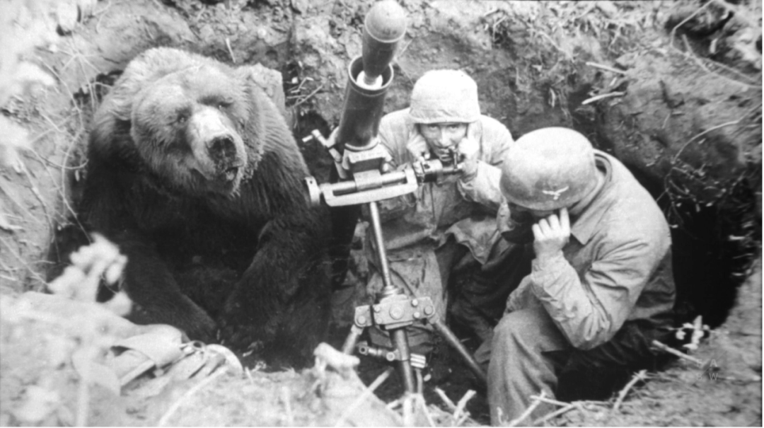 Floerks将家中少量残存的老照片、档案和利用CG建模的熊的形象,通过精细的合成与后期处理叠加在一起,让两种完全不同时空、不同媒介属性的影像似乎“自然”共存。这种无缝拼接本身就是一种伪造,形成出一段本来不可能存在的假档案。这只伪造的棕熊使得祖父的形象脱离了单一的“英雄”或“受害者”的标签。熊既可以是温柔的、可拥抱的家庭成员,也可以是经历过战争、带着伤痕和阴影的肉食动物。当熊出现在老照片的语境中时,画面形成了一种微妙的错位:很难用纪录片那一套镜头语言来阅读它,而是让人更多地把注意力投向其现实意义之外的表达上。