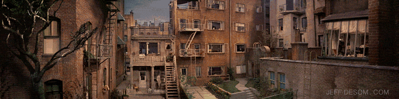 《后窗延时摄影》(Rear Window Timelapse)是由美国视觉艺术家 Jeff Desom 创作的一件空间投影装置,该作品获得了林茨电子艺术节2012年的金尼卡奖。作品的原始影像素材源自阿尔弗雷德·希区柯克 1954 年的电影《后窗》(Rear Window),通过对该电影中“庭院”场景的剪辑、重构与时间压缩,呈现出一个重新排列并置的后窗全景可视结构。