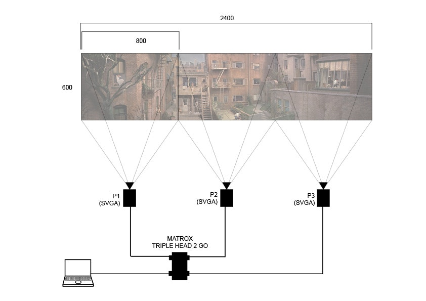 在 Desom的作品中,原电影的主线情节和主人公完全被移除,取而代之的是贯穿整部电影的庭院和周围公寓的全景日常片段。作者利用后期技术(After Effects和Photoshop),将希区柯克电影中主角视角看到的所有邻家窗景片段进行稳定、遮罩、拼接,组合成一个超宽幅的三频道投影画面。这个巨大的全景图呈现出后窗庭院里的所有活动:有人晾衣、有人用餐、夫妻争吵、老人休憩……原本在悬疑剧情中一闪而过的背景小人物,此刻成为画面中的主角,填满了20分钟的日常时间流动。