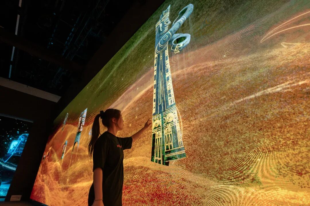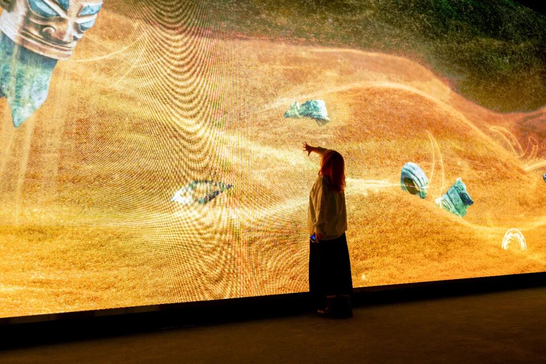 在这一空间中,文物并非静态陈列,而是通过超高清红外雷达感应体感交互被逐一“唤醒”。观众挥动手臂的动作,被转译为考古发掘中的“拂去尘沙”。这一设计巧妙地将专业考古行为转化为可被公众理解的身体经验,使“发现文明”的过程本身成为展览内容。