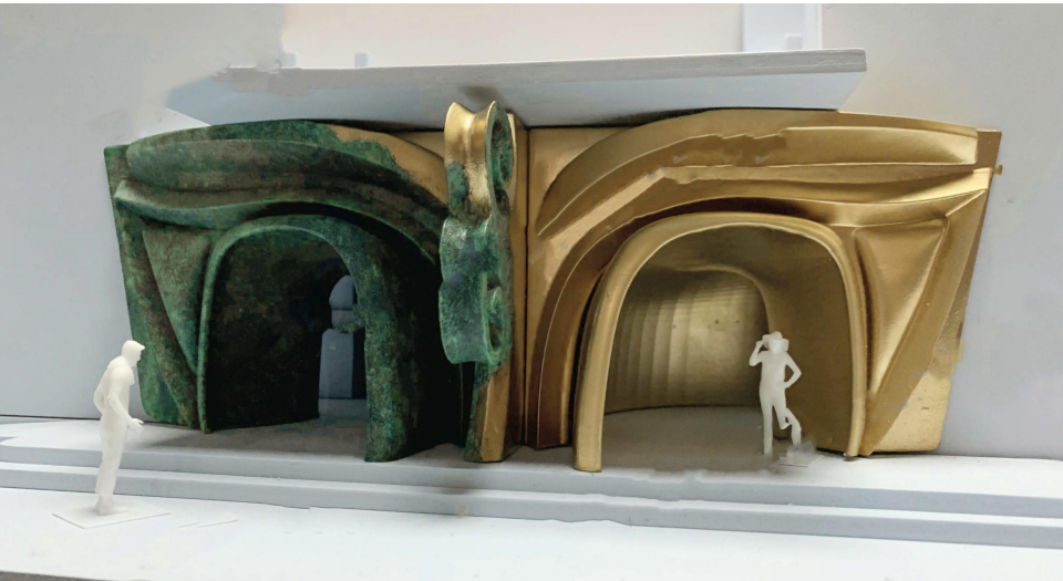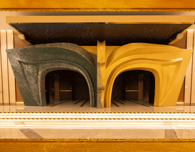 序厅入口以青铜面具为原型打造,面具左侧青铜色、右侧金黄色——金色象征文物原始状态,寓意“时空之门”,观众从金色进入,仿佛从当下穿越回数千年前。随着观众深入,顶部“星河隧道”屏幕缓缓流动古蜀星象,让人仿佛进入时空隧道。出口再次回到青铜色面具,象征从远古回归现实。色彩、空间与光影的变化,隐喻了时间流动,形成完整的沉浸式体验。